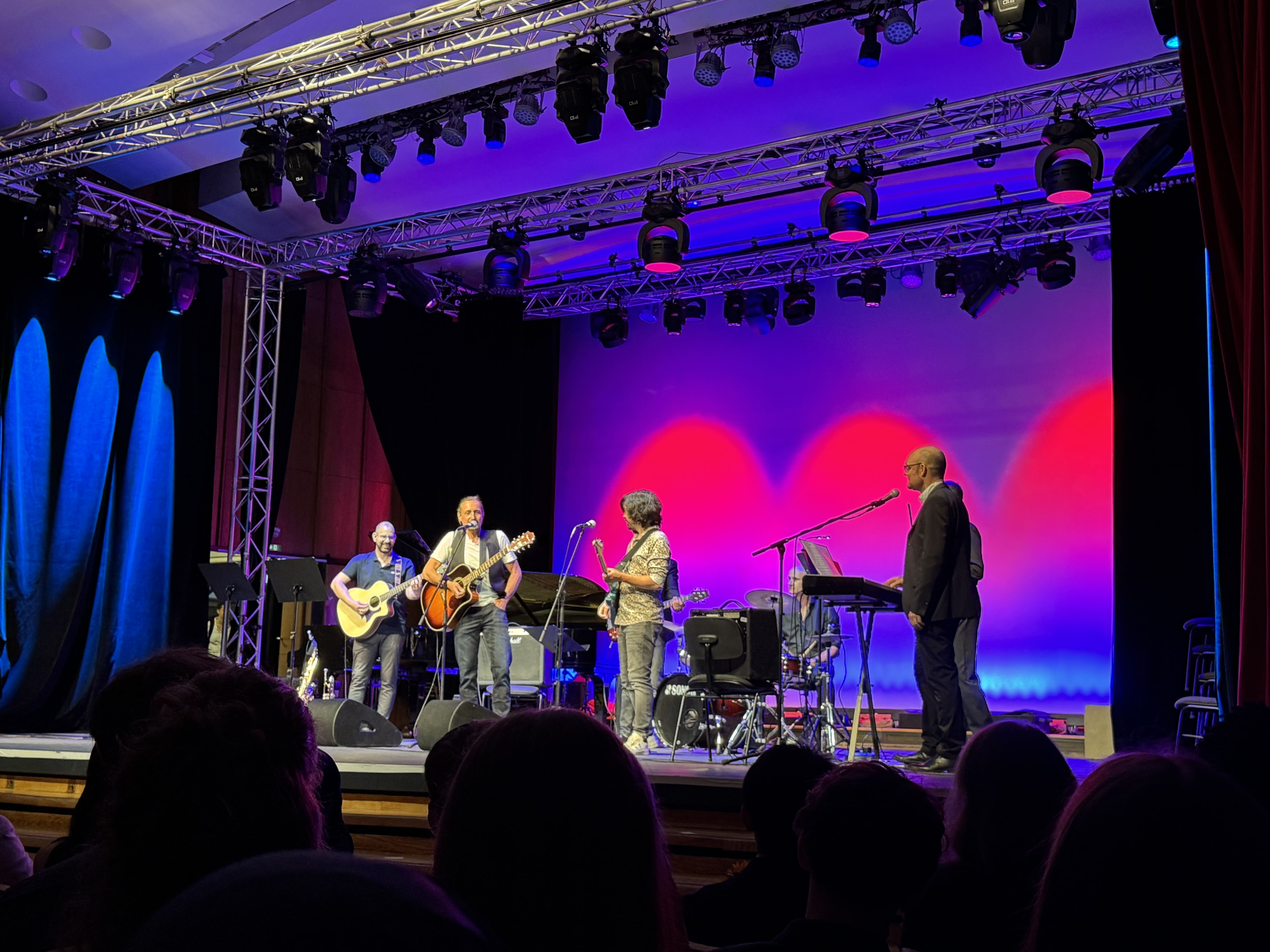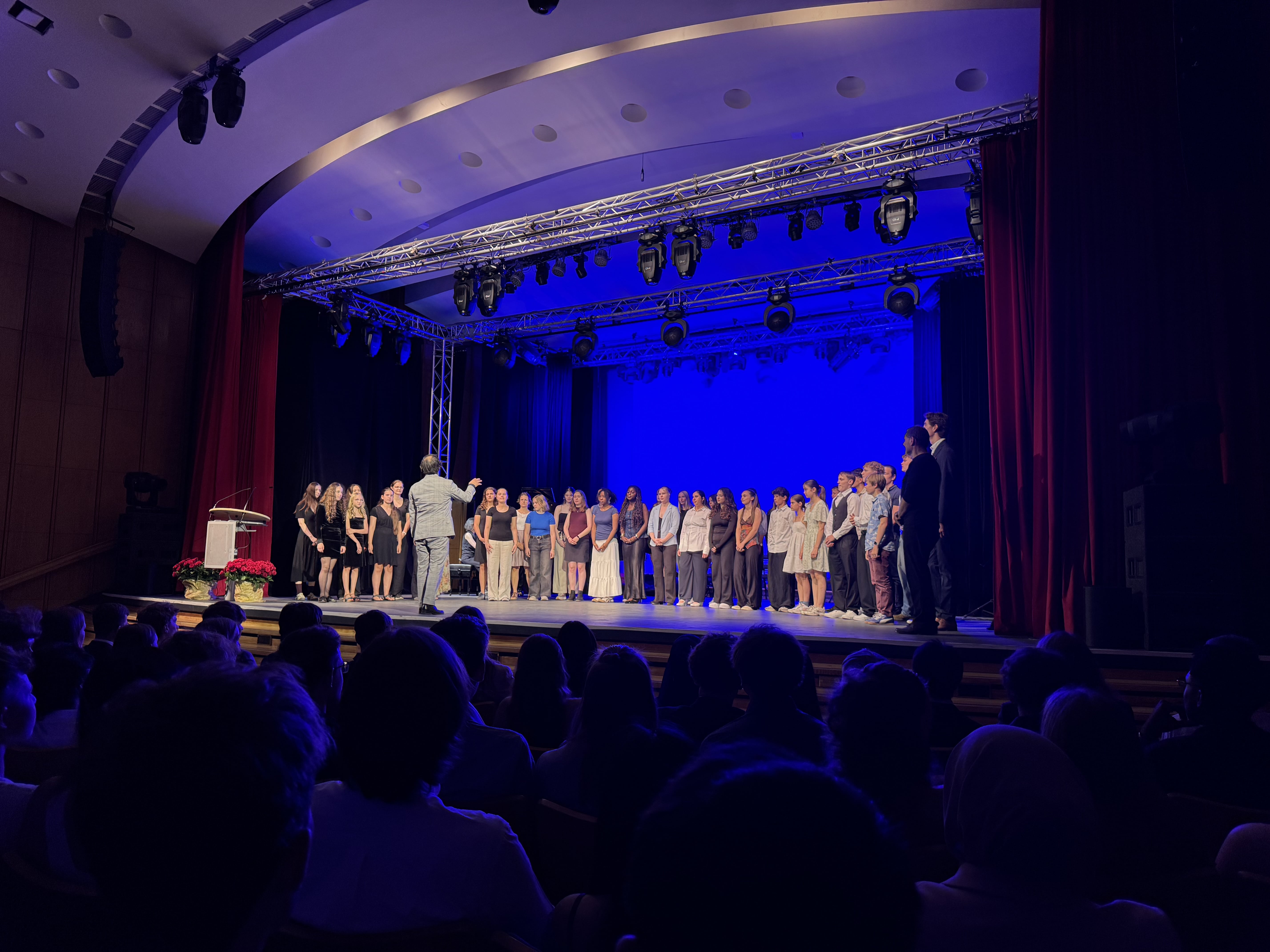 Vier mutige Fünftklässler:innen brachten auf humorvolle und erstaunlich kluge und selbstbewusste Weise ihre Bewunderung für den langen Weg bis zum Abitur zum Ausdruck – sie standen da, wo die Großen mal angefangen haben. Außerdem traten auf der große Chor, die Jazzband, die „Lehrchen“ – der Chor der singenden Lehrer:innen (ich natürlich dabei, schwitz, der ganze englische Text, ist das heiß in diesem Saal…) und auch die Lehrerband spielte äußerst schwungvoll auf – und das, obwohl ihre superbe Leadsängerin fehlte. Der Applaus sprach Bände.