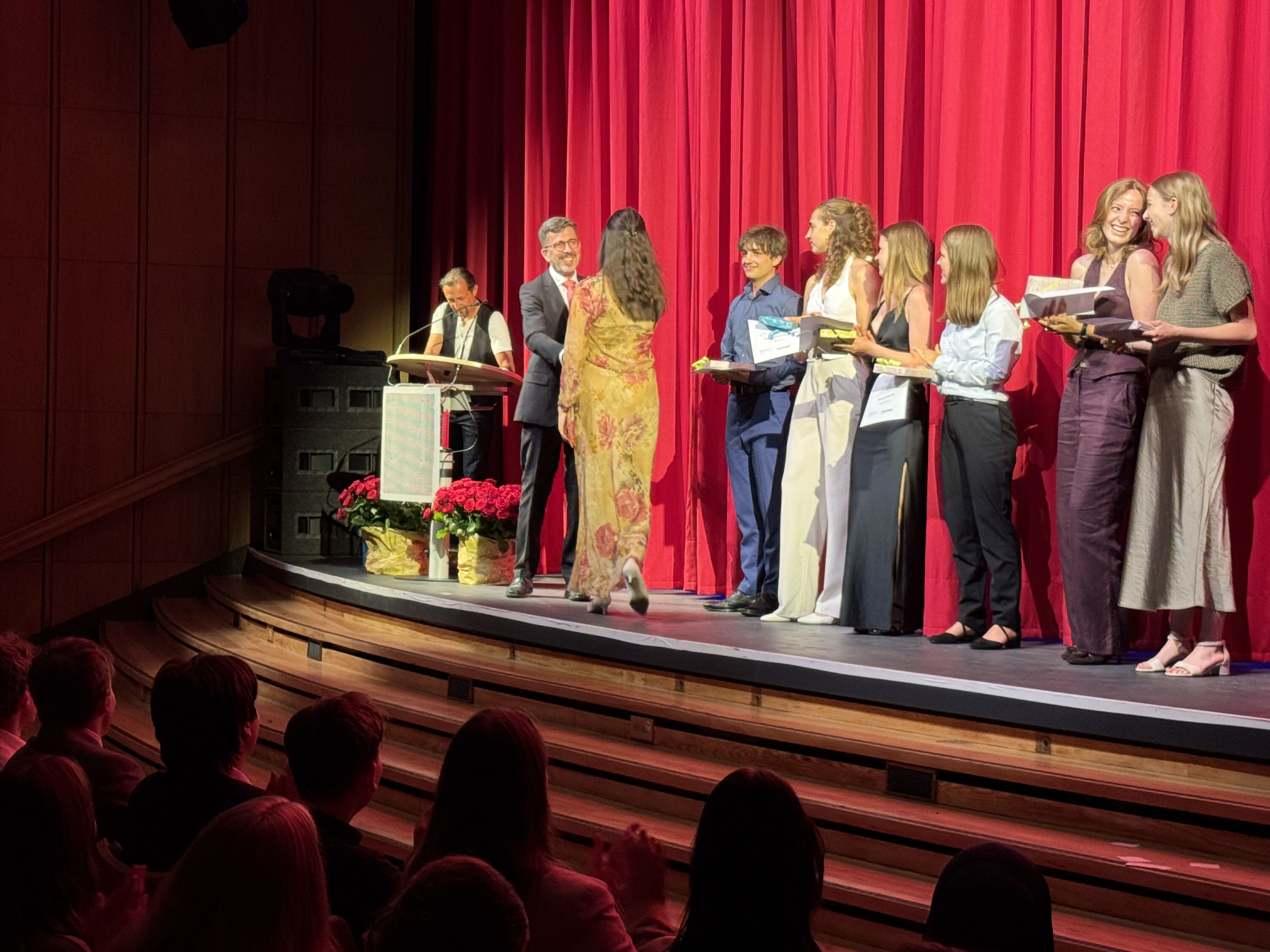 Besondere Leistungen wurden mit Sonderpreisen geehrt: in Philosophie, Geschichte, Chemie, Biologie, Physik, Mathe und Informatik. Und es gab zweimal den „Super Hummi“ für besonderes Engagement über die Schulgrenzen hinaus. Siyar Isik bekam ihn für sein außerordentliches Engagement als Schülersprecher und Nicola von Orlow für ihr künstlerisches Wirken– zwei, die den Geist der Schule in den letzten Jahren mitgeprägt haben.
