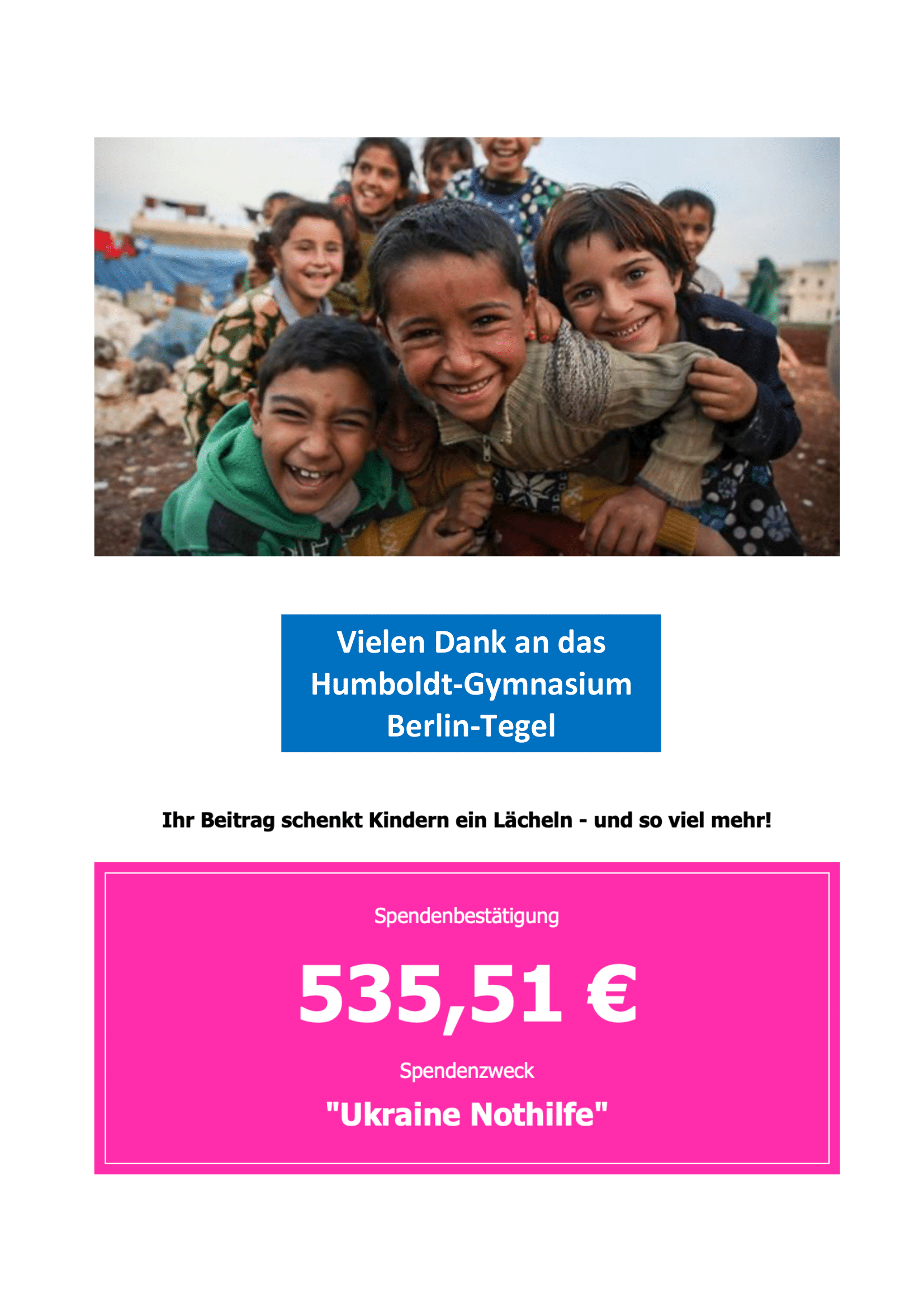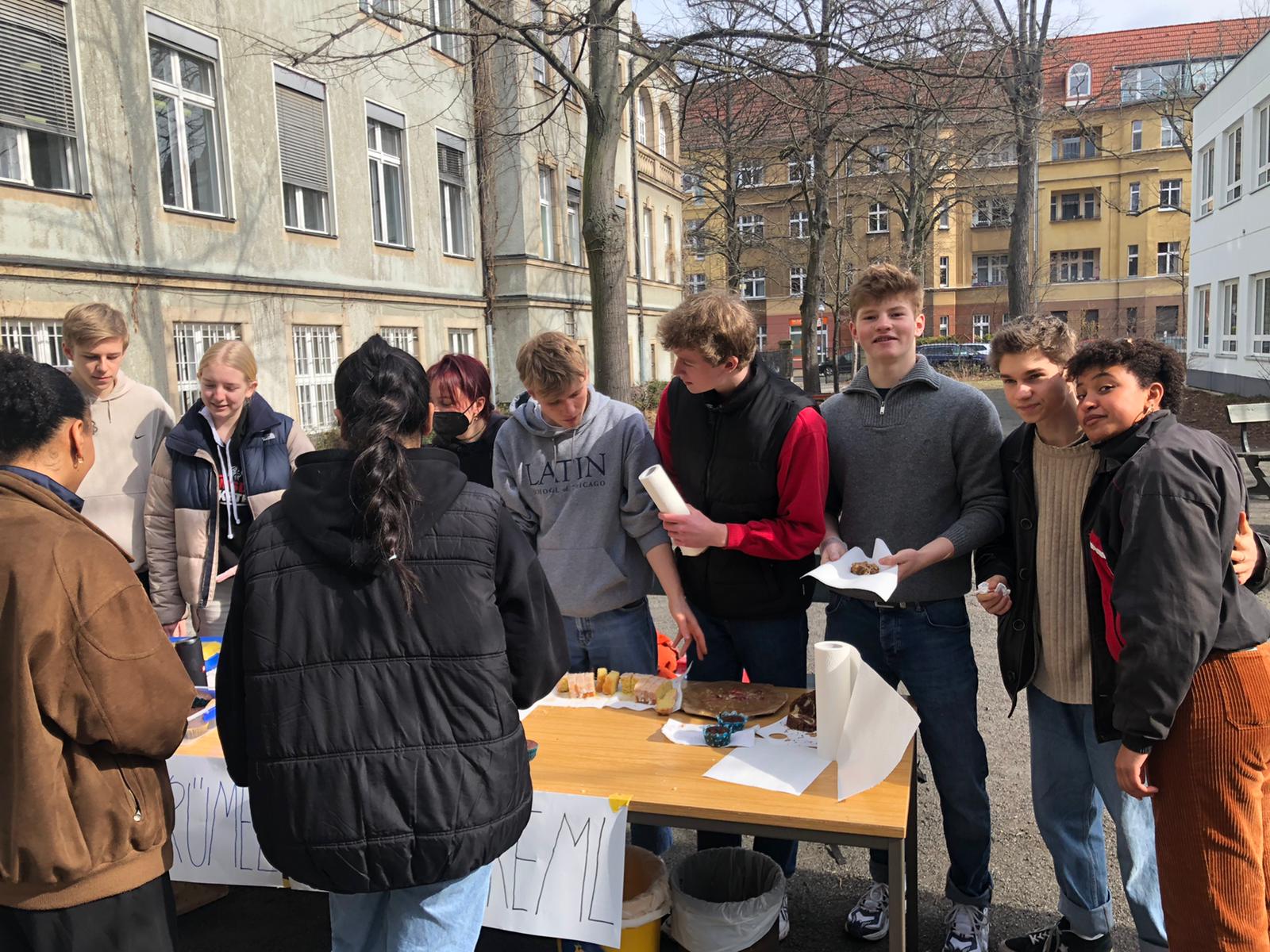 Wir (Charlotte Lindner und Max Schlodder aus der Q4) haben uns aufgrund der humanitären Krise in der Ukraine entschieden, einen Kuchenverkauf als Spendenaktion zu organisieren. Uns waren besonders die betroffenen Kinder wichtig, weshalb wir uns entschieden, an die Organisation UNICEF zu spenden. Mit Hilfe einiger Freunde haben wir Kuchen gebacken und diese auf dem Schulhof während der Mittagspause verkauft. Die Aktion ein voller Erfolg, da wir alle Kuchen verkaufen konnten und inklusive Spenden 535€ sammeln konnten. Schön war außerdem zu sehen, wie kurzfristig man eine solche Spendenaktion auf die Beine stellen kann. Wir bedanken uns bei allen für die großzügige Unterstützung!