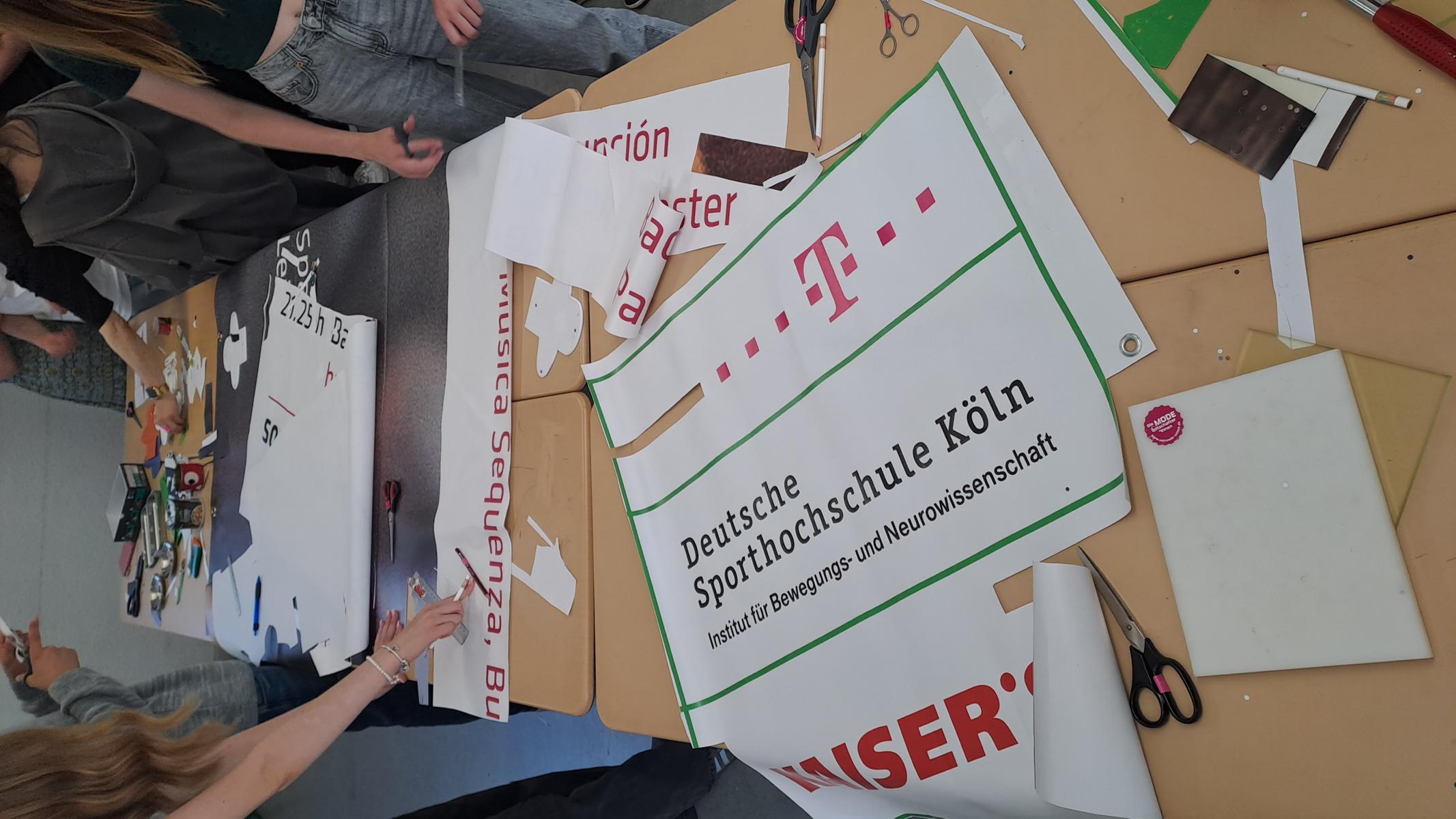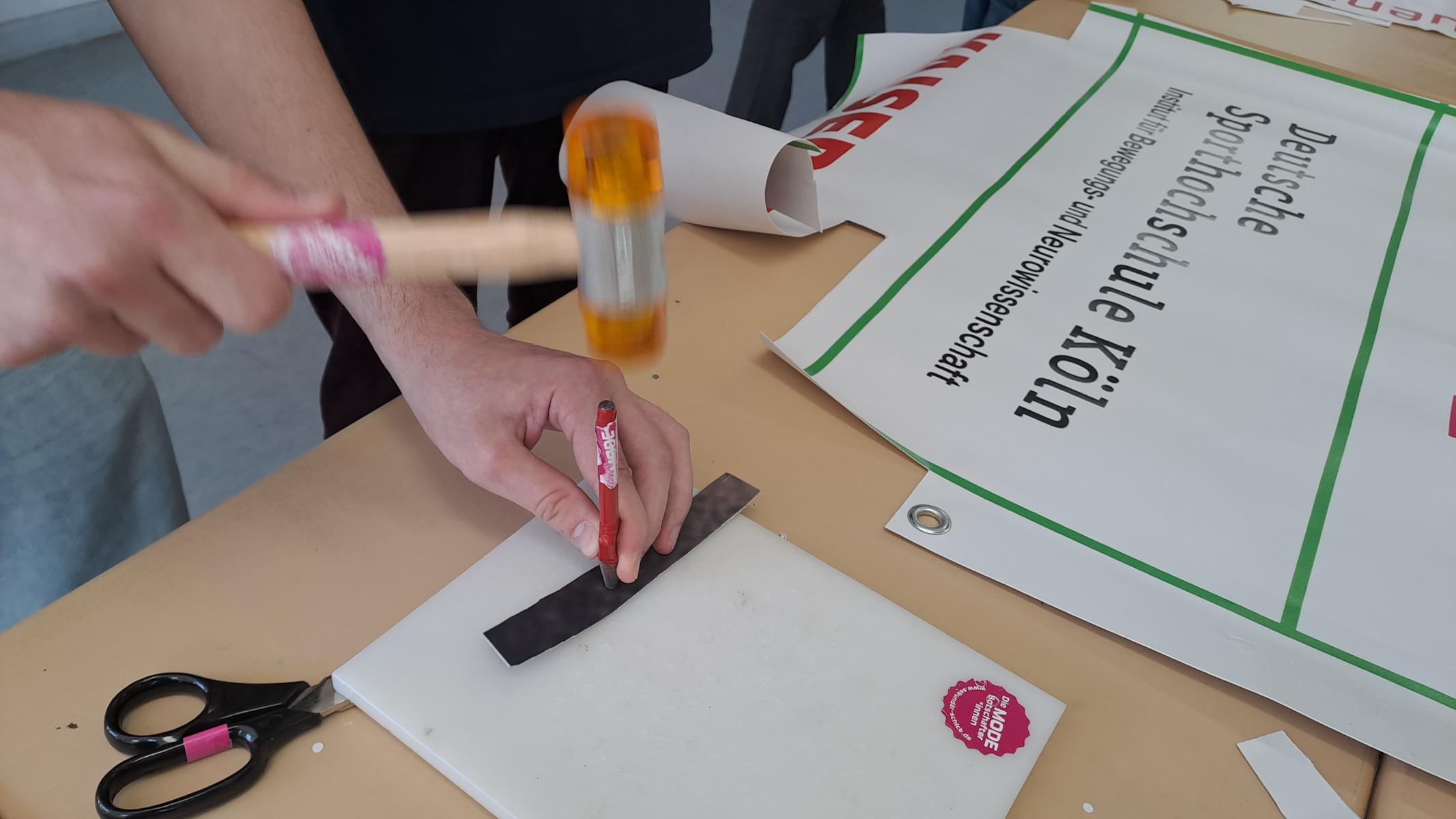 Der Workshop fing an mit einer kurzen Einleitung von Sigrid, dann haben wir alte Werbebanner von einem Festival bekommen, welche nach Ende der Veranstaltung wohl entsorgt worden wären. Sigrid hat uns gezeigt, wie man verschiedene Sachen wie z.B. Schlüsselanhänger, Kabelbinder, Armband oder eine Tasche aus dem Plakat machen konnte. Die meisten Jungen haben einen Schlüsselanhänger gemacht, während die Mädchen aus unserer Klasse Taschen, Armbänder und Schlüsselanhänger gemacht haben. Es war schön, dass wir uns aussuchen durften, was wir gestalten und auch unsere Pausen selbst einteilen konnten.