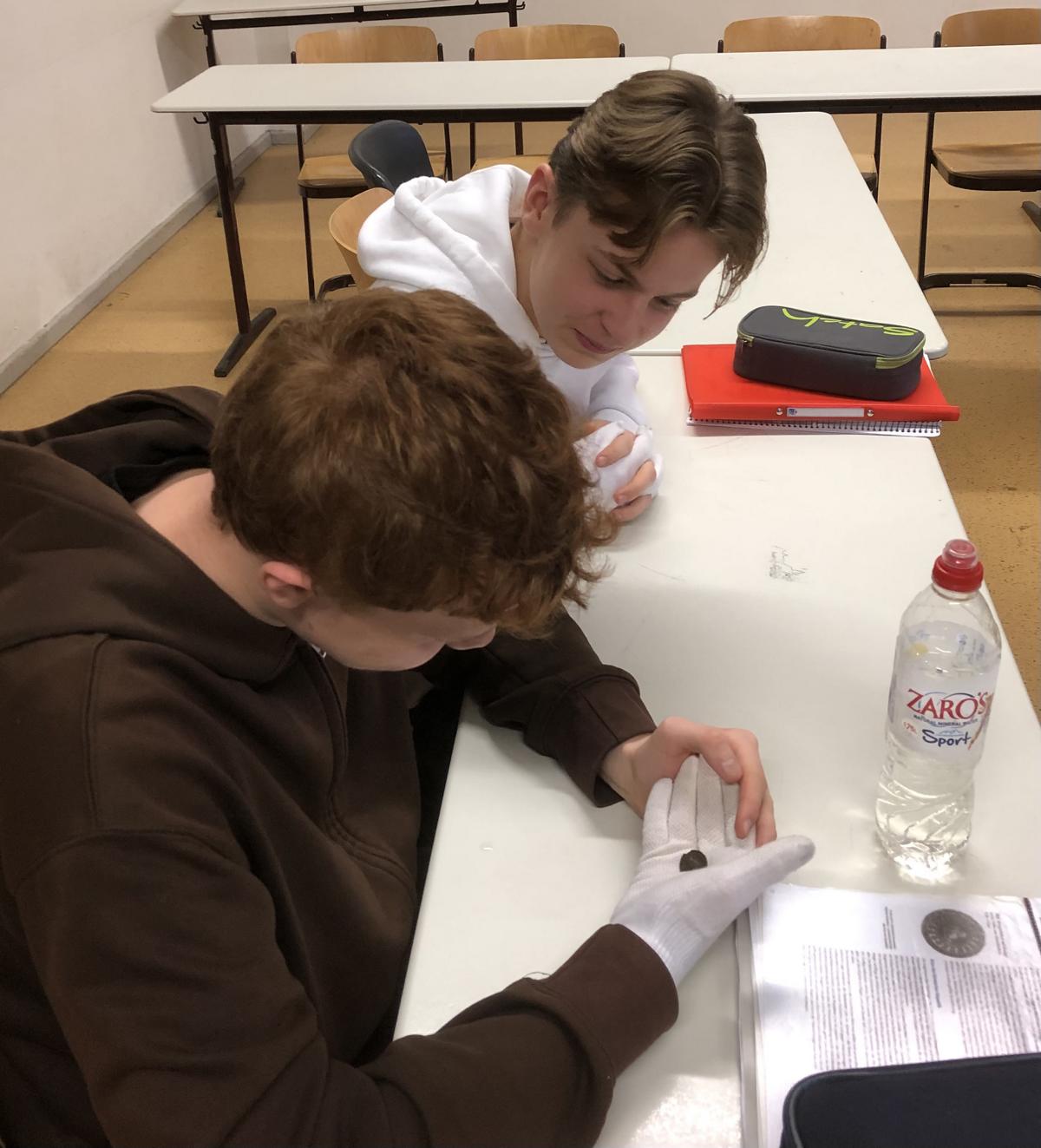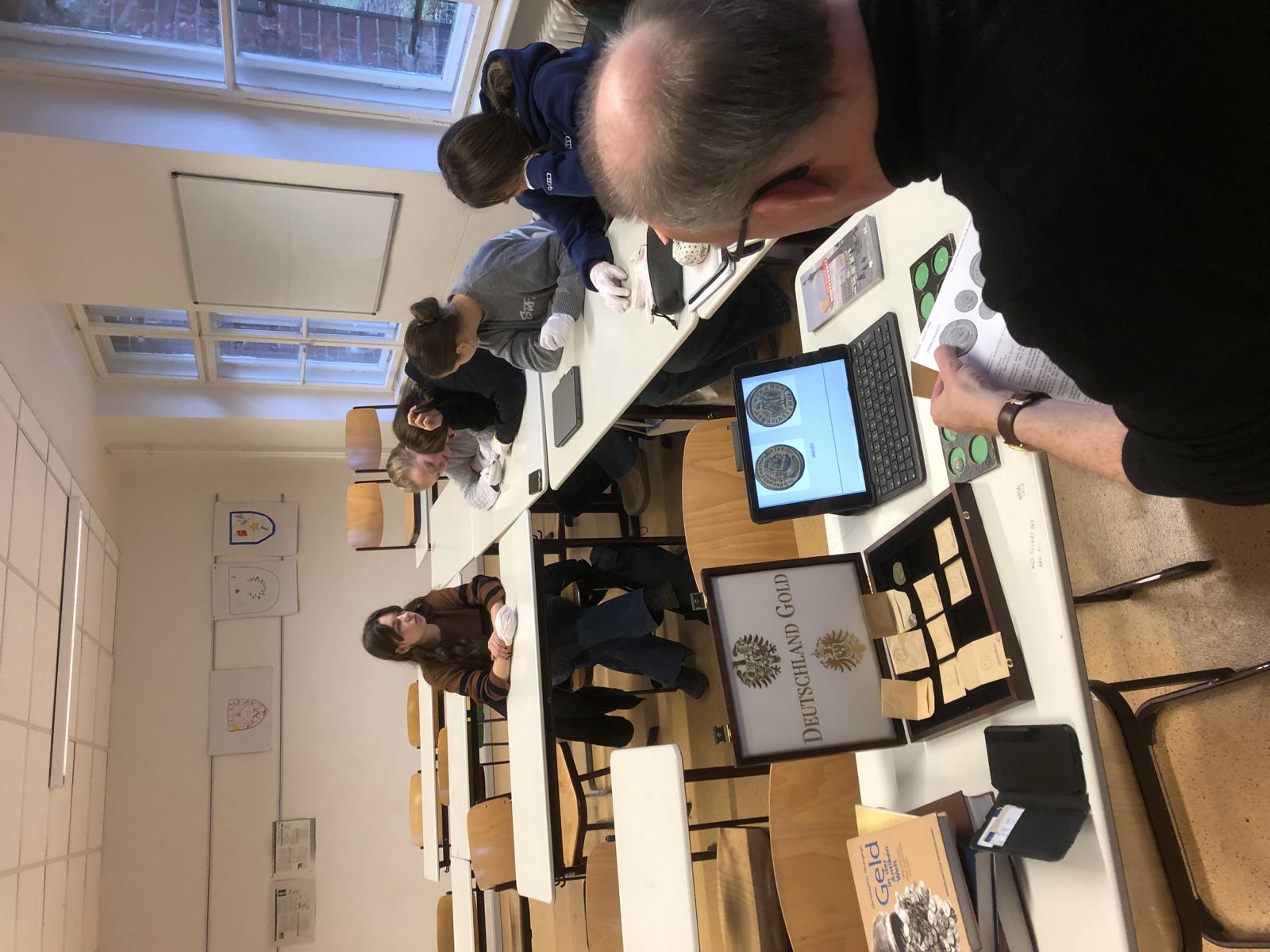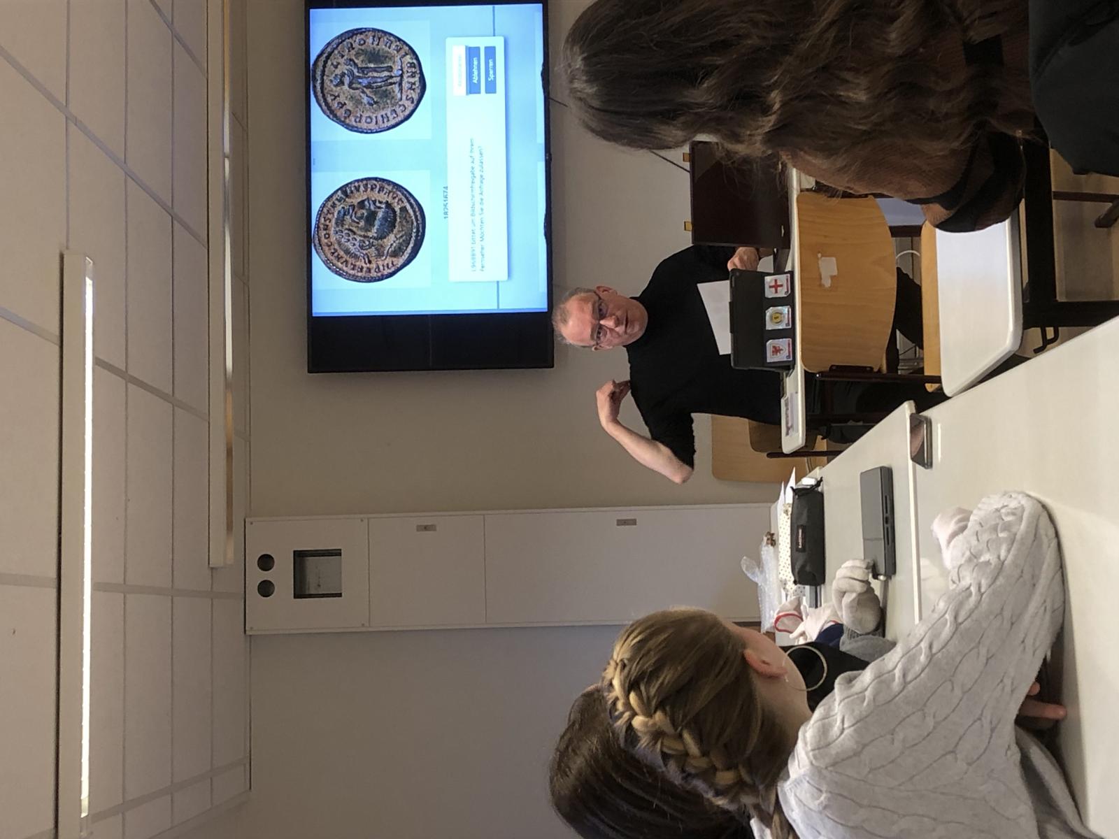 Am 3.12.24 war der Stellvertretende Direktor des Münzkabinetts (im Berliner Bode-Museum) Dr. K. Dahmen im Leistungskurs Geschichte in der Q1 zu Gast, um eine Münzübung mit den Schülerinnen und Schülern durchzuführen. Dabei bestaunten, beschrieben und analysierten die Schülerinnen und Schüler Originale von Münzen aus der Römischen Republik und der Kaiserzeit. Hr. Dr. Dahmen ordnete die Münzen bzw. unsere Befunde höchst kenntnisreich und unterhaltsam in die römische Geschichte ein.