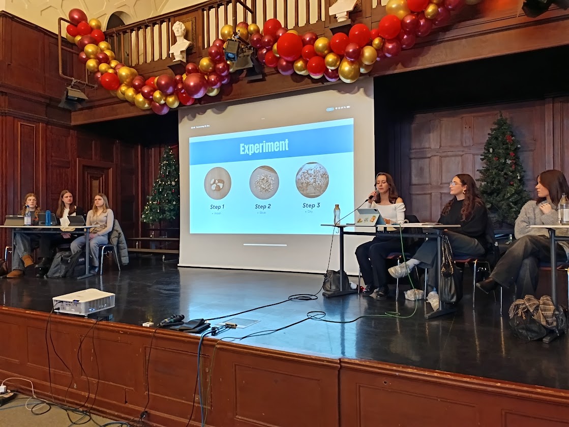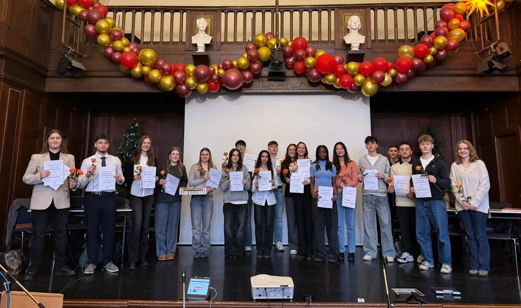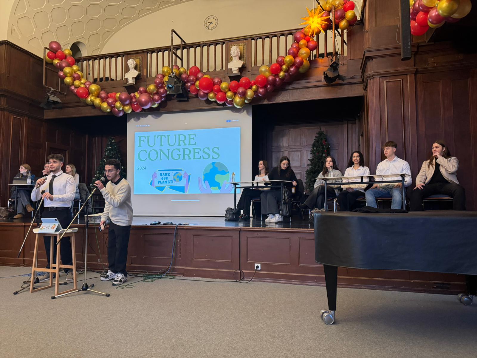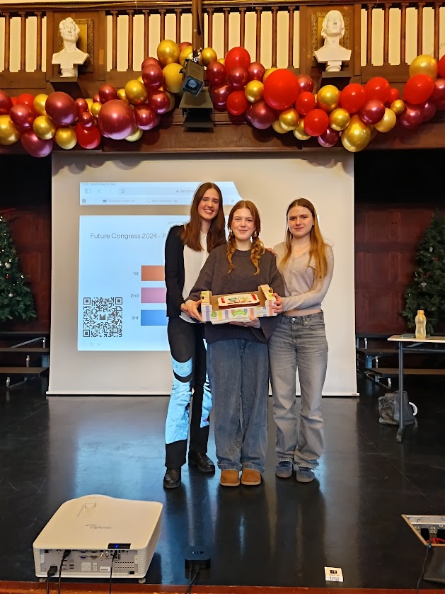 Am 19.12. fand der Future Congress 2024 in der Aula statt – ein Event, bei dem unsere Schülerinnen und Schüler erneut auf ganzer Linie beeindruckten. Drei Finalist:innen der Englisch-Leistungskurse der Q3, betreut von Herrn Roth, Frau Losensky und Herrn Dr. Höllering, präsentierten ihre zukunftsweisenden Projekte: Mycelium Packaging (Alicia, Greta und Ella), Mushroom Leather (Phoebe und Ranya) sowie Wave Energy (Alexander, Cosima, Leon und Rania). Die Teams überzeugten nicht nur durch fachliche Exzellenz, vertieftes Expertenwissen und souveränes Auftreten, sondern meisterten auch die zahlreichen kritischen Fragen des Publikums mit Professionalität und fundierten Antworten.