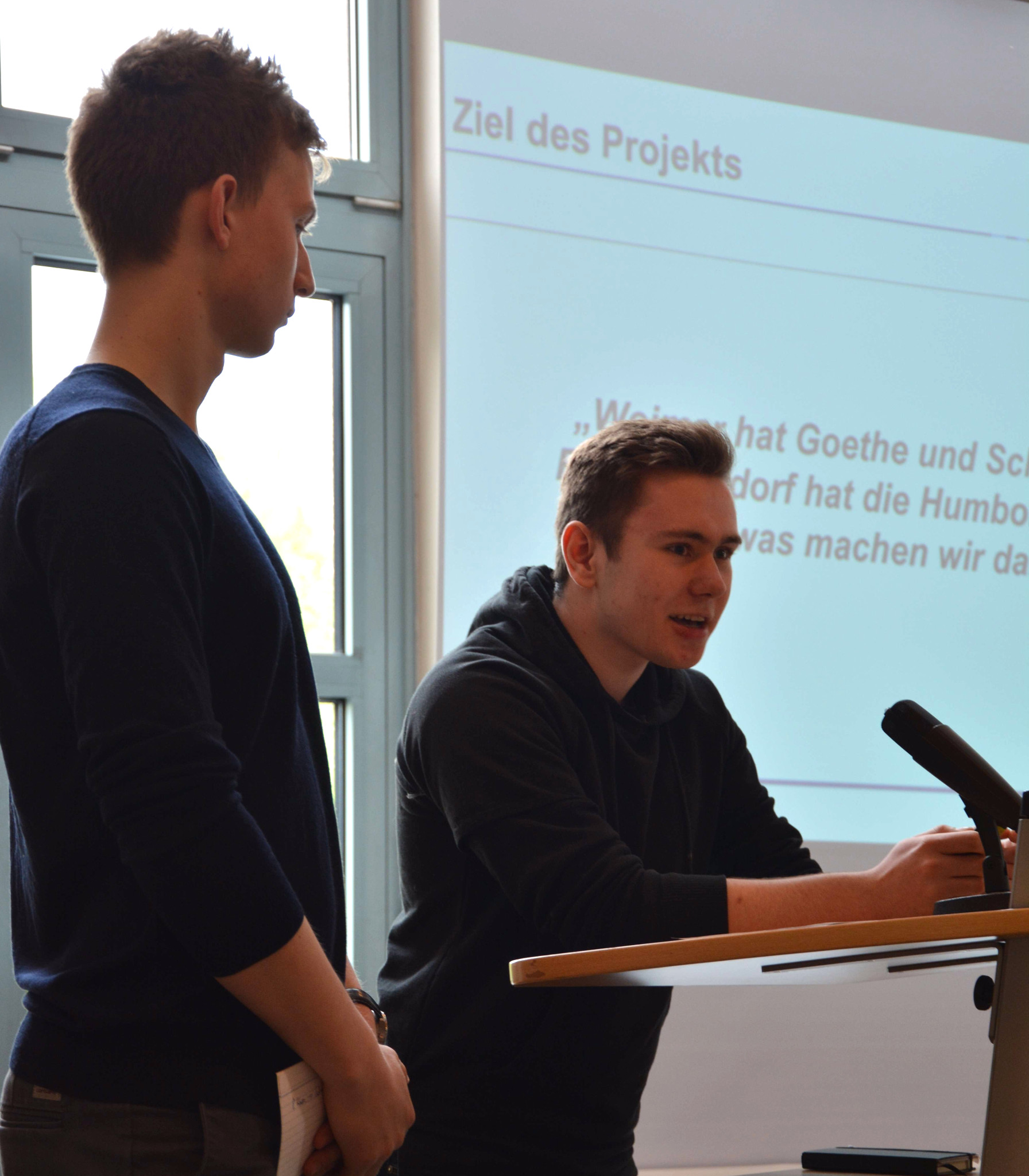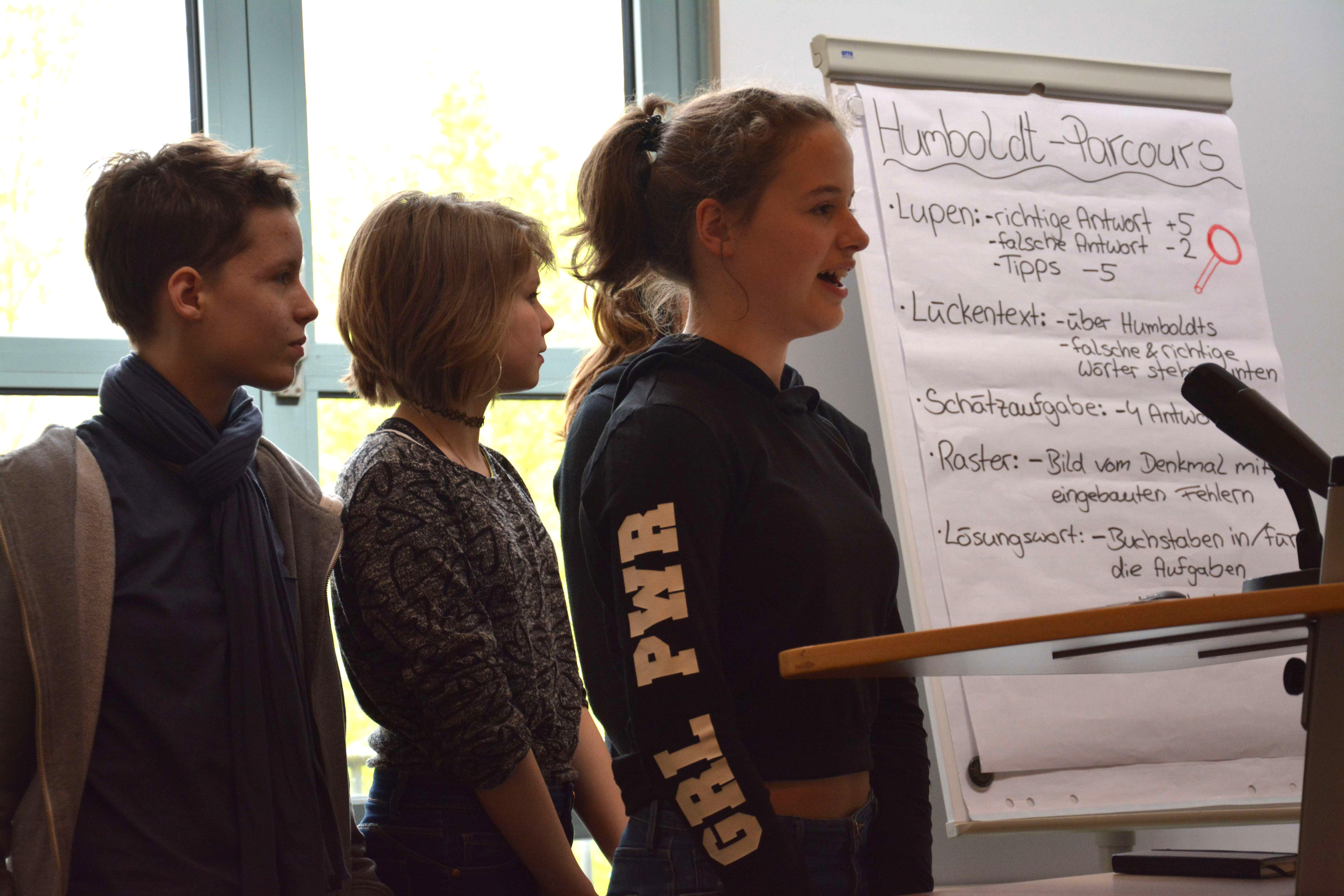 Am 3. Mai stellten Schülerinnen und Schüler des Leistungskurses Geschichte und der Klasse 8b in der Humboldt-Bibliothek erste Ideen für einen webbasierten Humboldt-Parcours durch Tegel vor. An Orten, die mit den Humboldt-Brüdern verbunden sind, wird es möglich sein, Informationen abzurufen und Quizfragen zu beantworten. Das in Wilhelms 250. Geburtsjahr gestartete Projekt soll 2019, in Alexanders 250. Geburtsjahr, abgeschlossen sein. Von Seiten der Lehrer wird das Projekt von Herrn Klingenfuß, Herrn Kellermann und Herrn Gerhardt (für das Fach Geschichte) sowie von Herrn Wagner (für das Fach Informatik) betreut; auch das Fach Wirtschaft soll mit eingebunden werden. Neben Tim-Christopher Zeelen (MdA), der das Projekt angestoßen hat, würdigten die Bezirksstadträtin Katrin Schultze-Berndt und Dr. Jörg Kayser das beeindruckende Engagement der Jugendlichen. Seitens der Humboldt-Bibliothek wird das Projekt von Christiane Bornett und Hanno Koloska unterstützt.