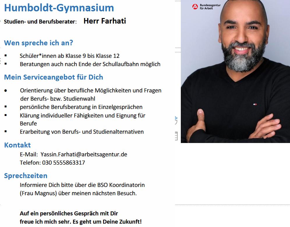 Diesen Prozess begleiten wir am Humboldt-Gymnasium gemeinsam mit unserem Fachberater von der Jugendberufsagentur von der 8. Klasse bis zum Abgang von der Schule.