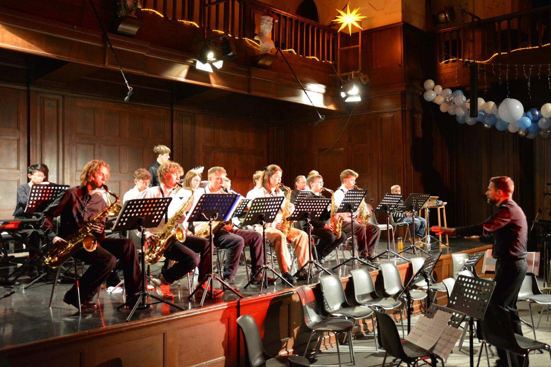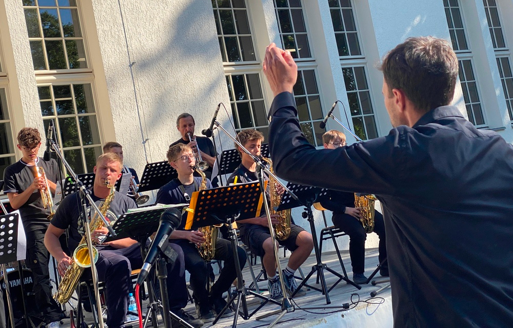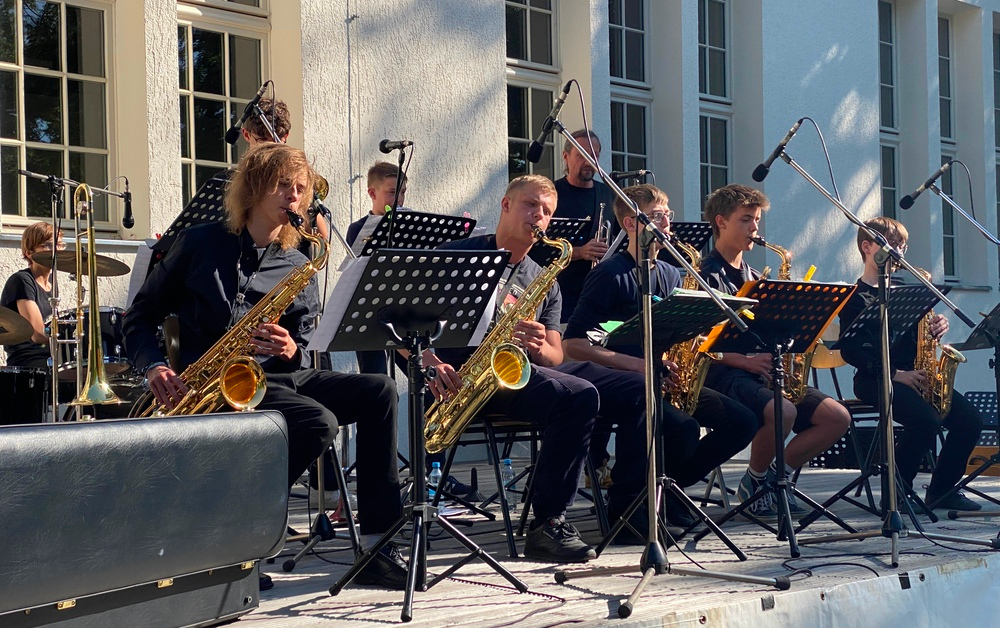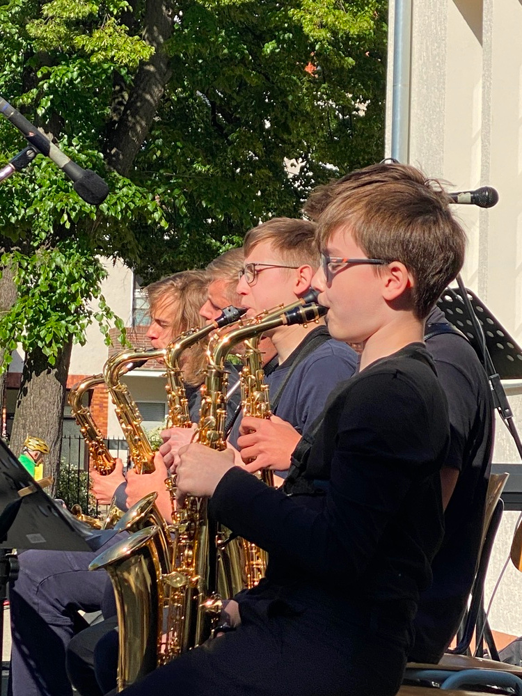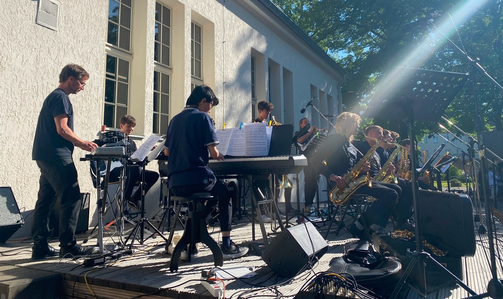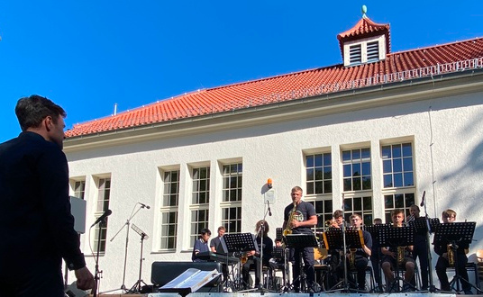 Die Humboldt JazzXplorers (Jazzband des Humboldt-Gymnasiums) haben bei schönstem Wetter die 21. Reinickendorfer Bigband-Night auf dem Hof der Benjamin-Franklin-Schule eröffnet.