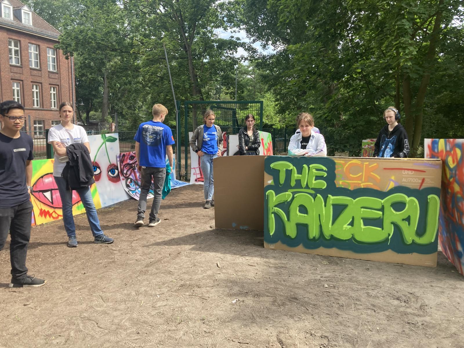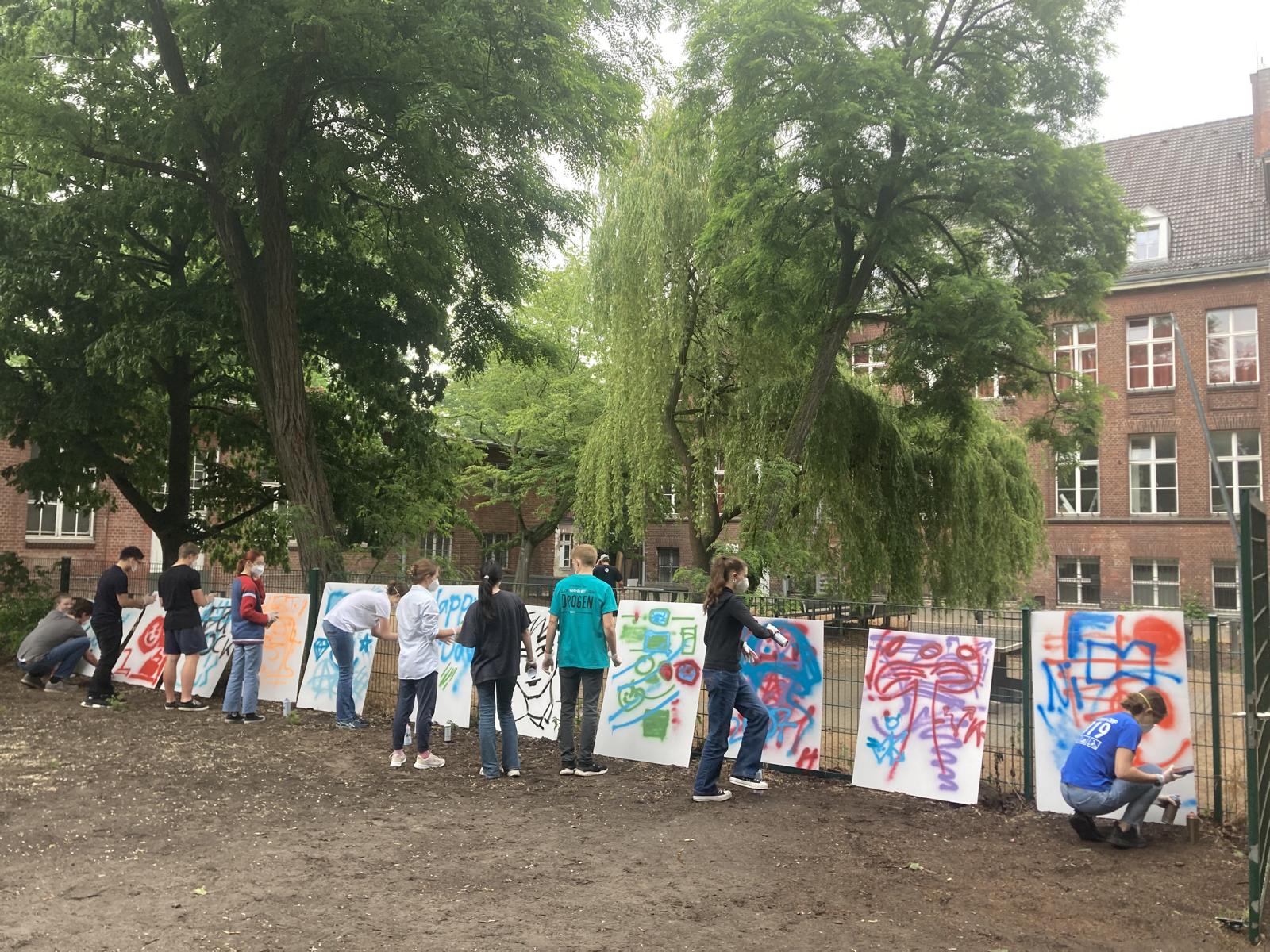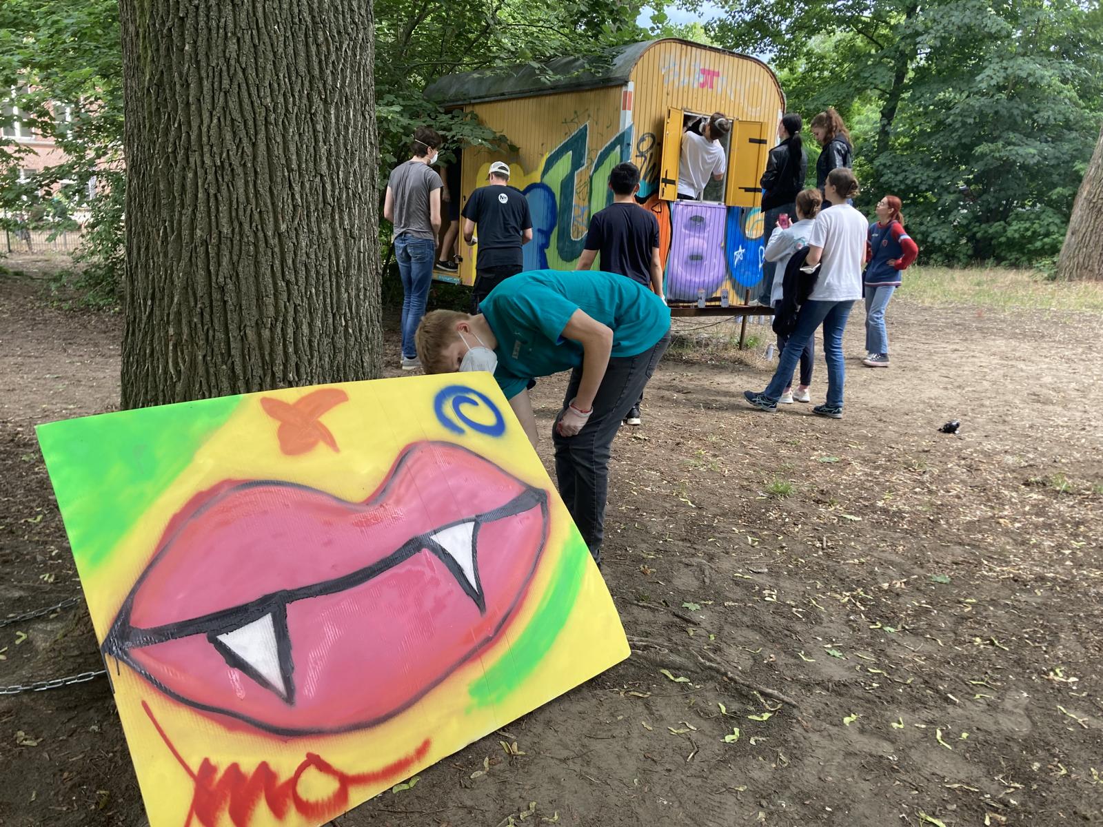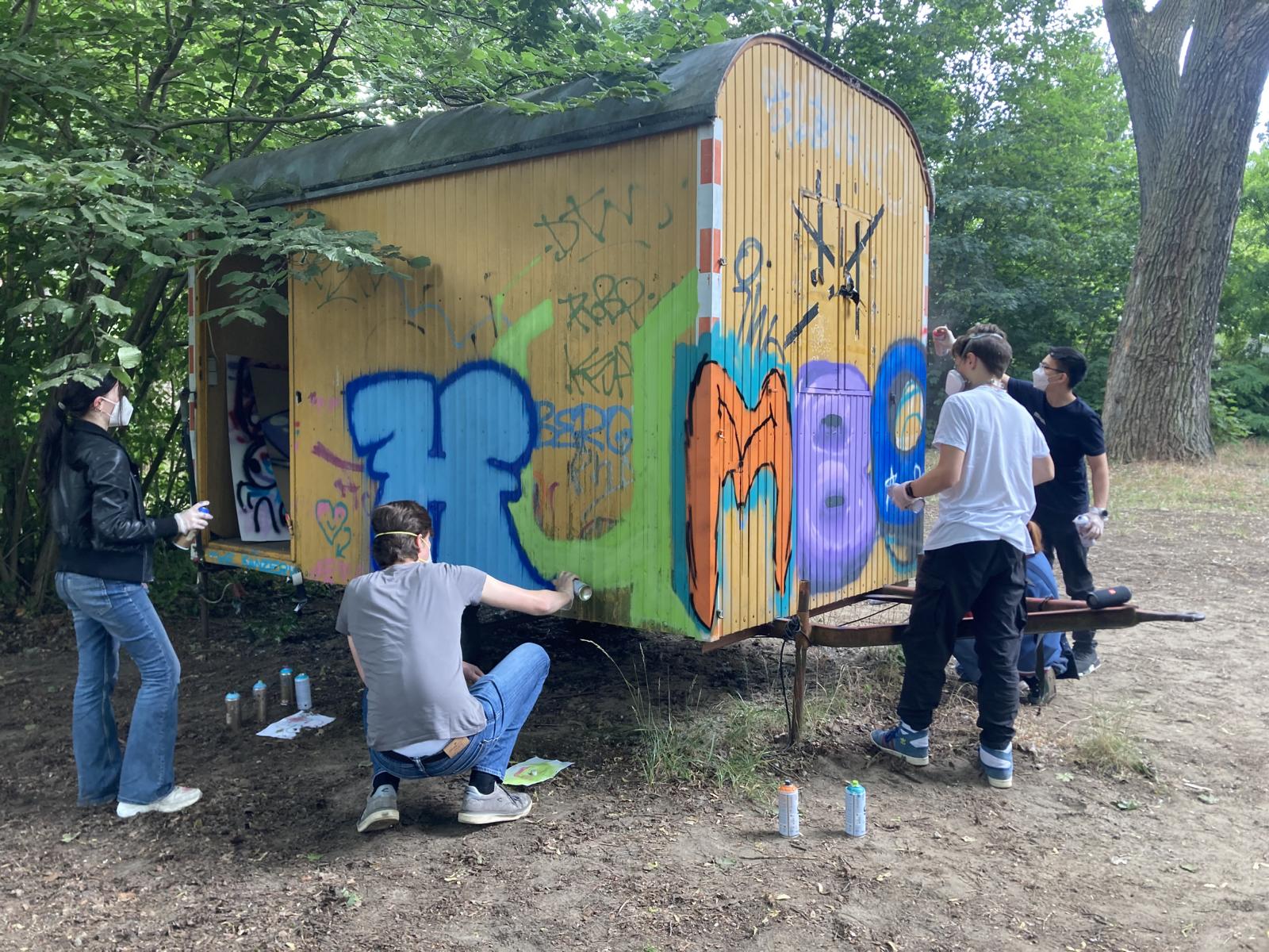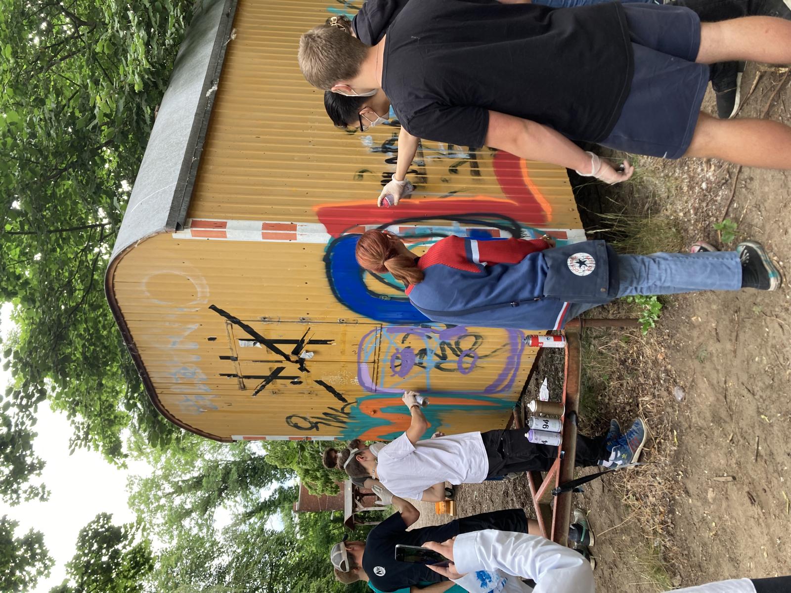 28.06. Endlich mal SPRAYEN! 12 Schüler:innen der Klasse 10h beim Graffiti-Workshop
