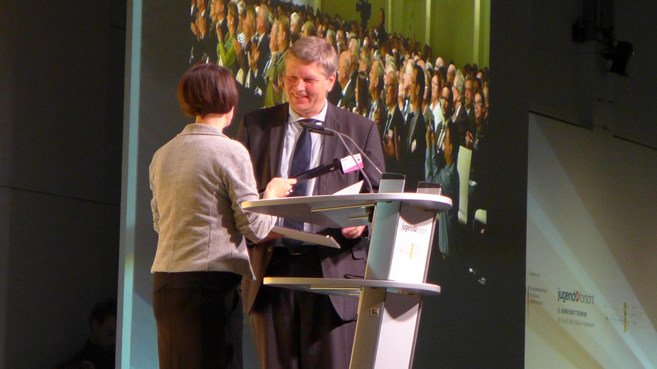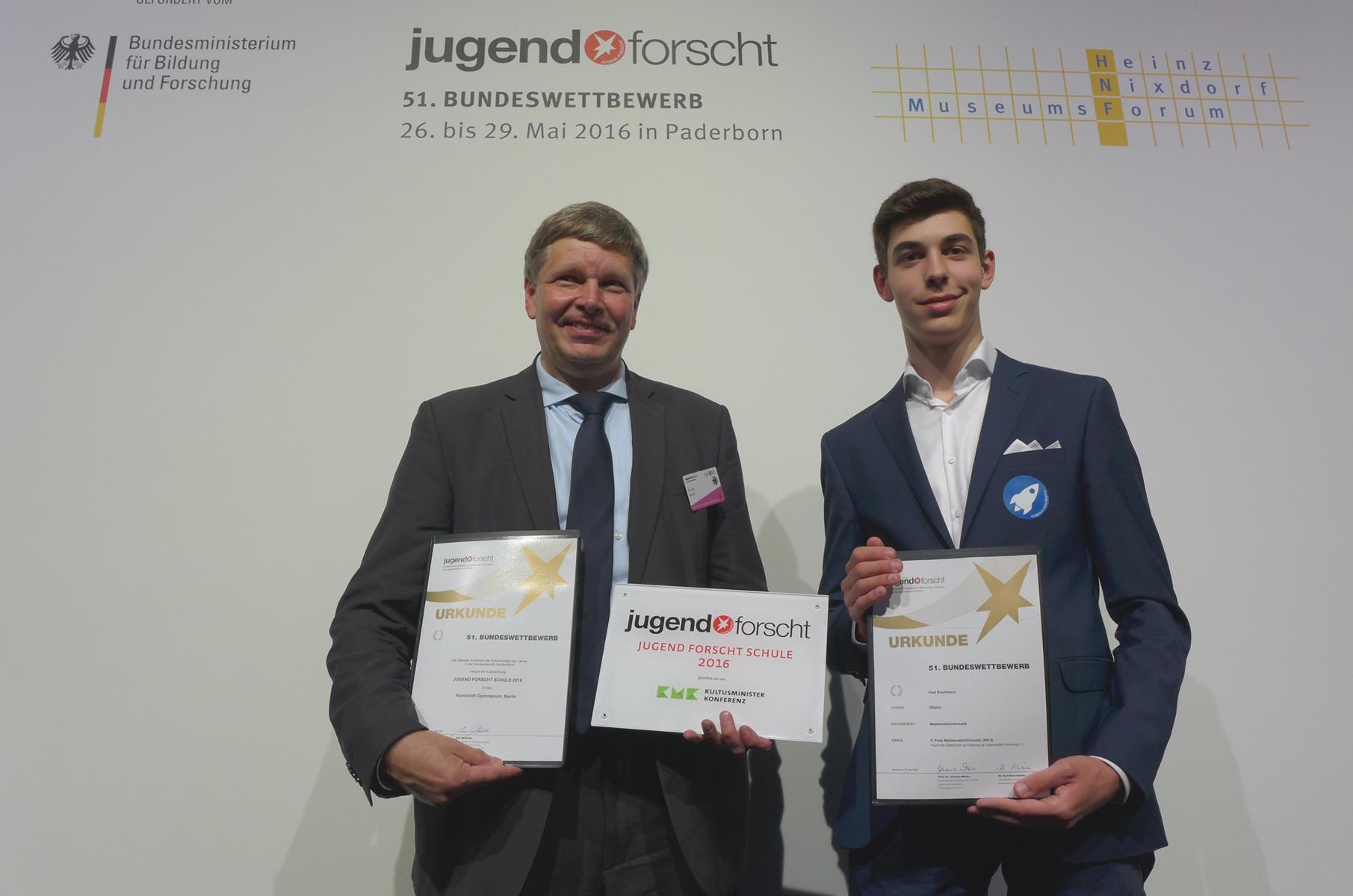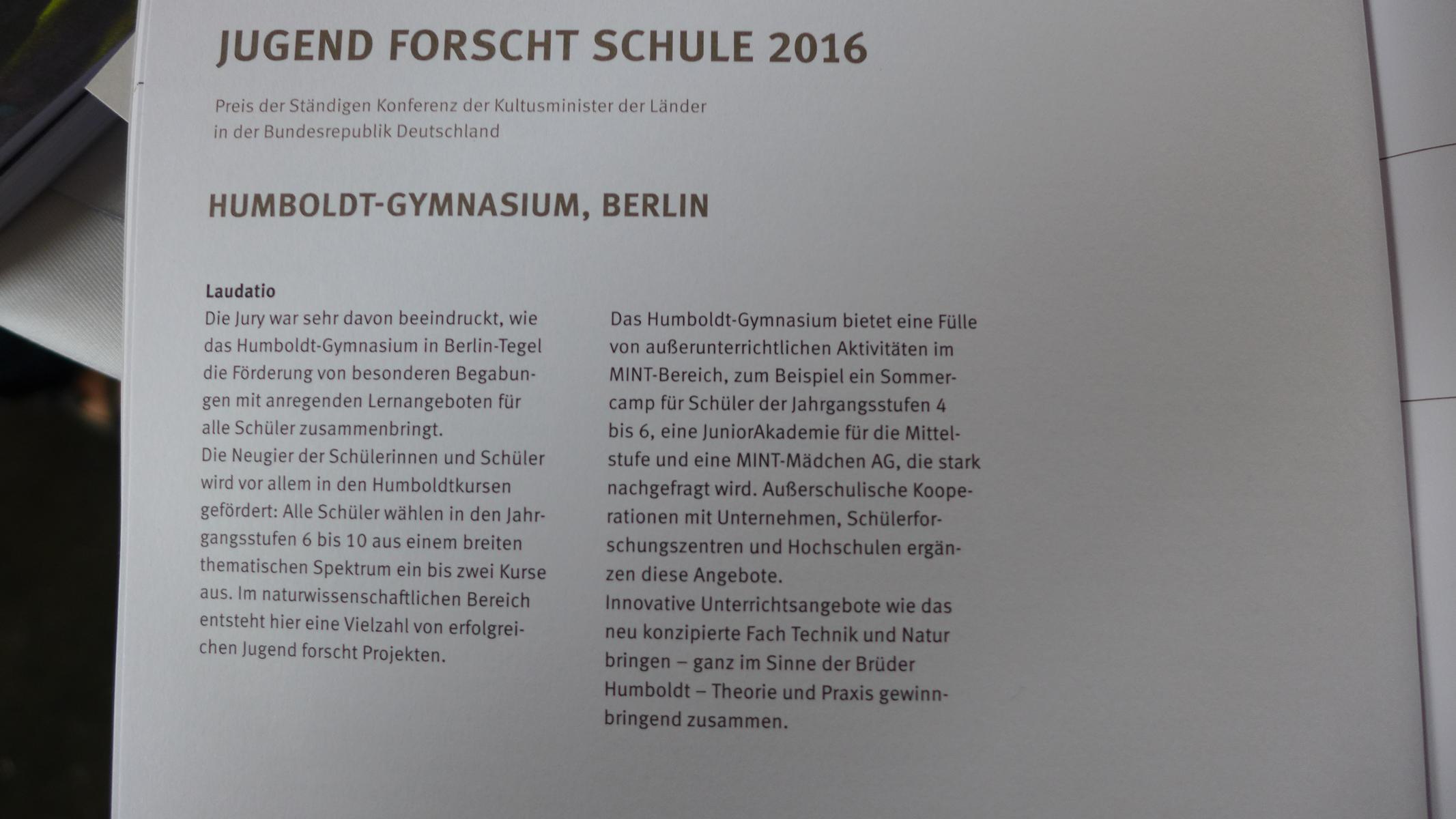 Das Humboldt-Gymnasium wurde beim 51. Bundeswettbewerb Jugend forscht in Paderborn mit dem KMK-Sonderpreis "Jugend forscht Schule 2016" ausgezeichnet. Die Auszeichnung überreichte Dr. Claudia Bogedan, KMK-Präsidentin und Bremer Bildungssenatorin.