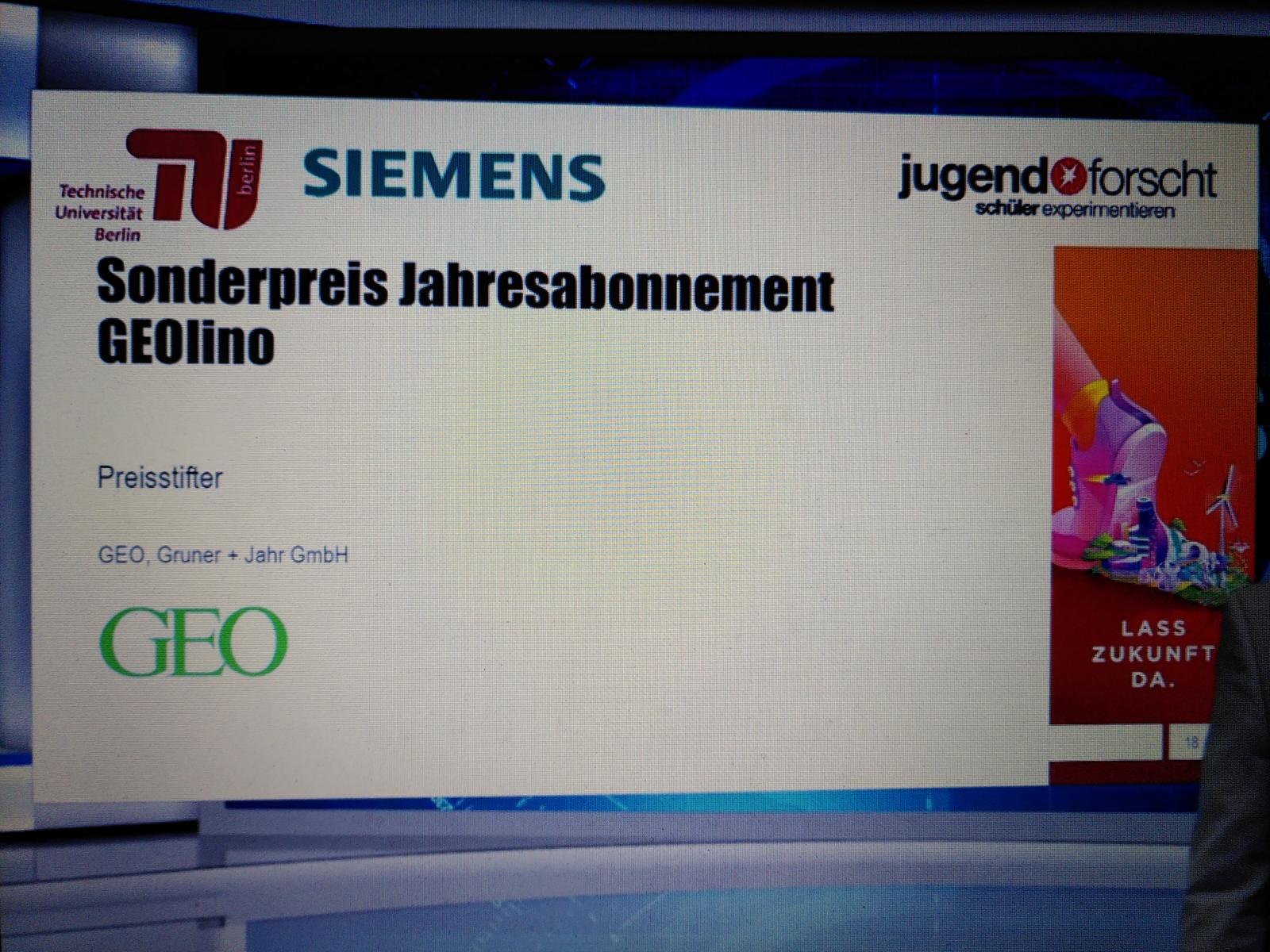 Hannah Weyland, Rebekka Waindok und Justus Stephan haben beim Landeswettbewerb Schüler experimentieren am 20.03.21 den 2. Preis und den Sonderpreis Jahresabonnement GEOlino gewonnen. Die Gruppe wurde von Frau Ziomkowska und Herr Röser betreut.