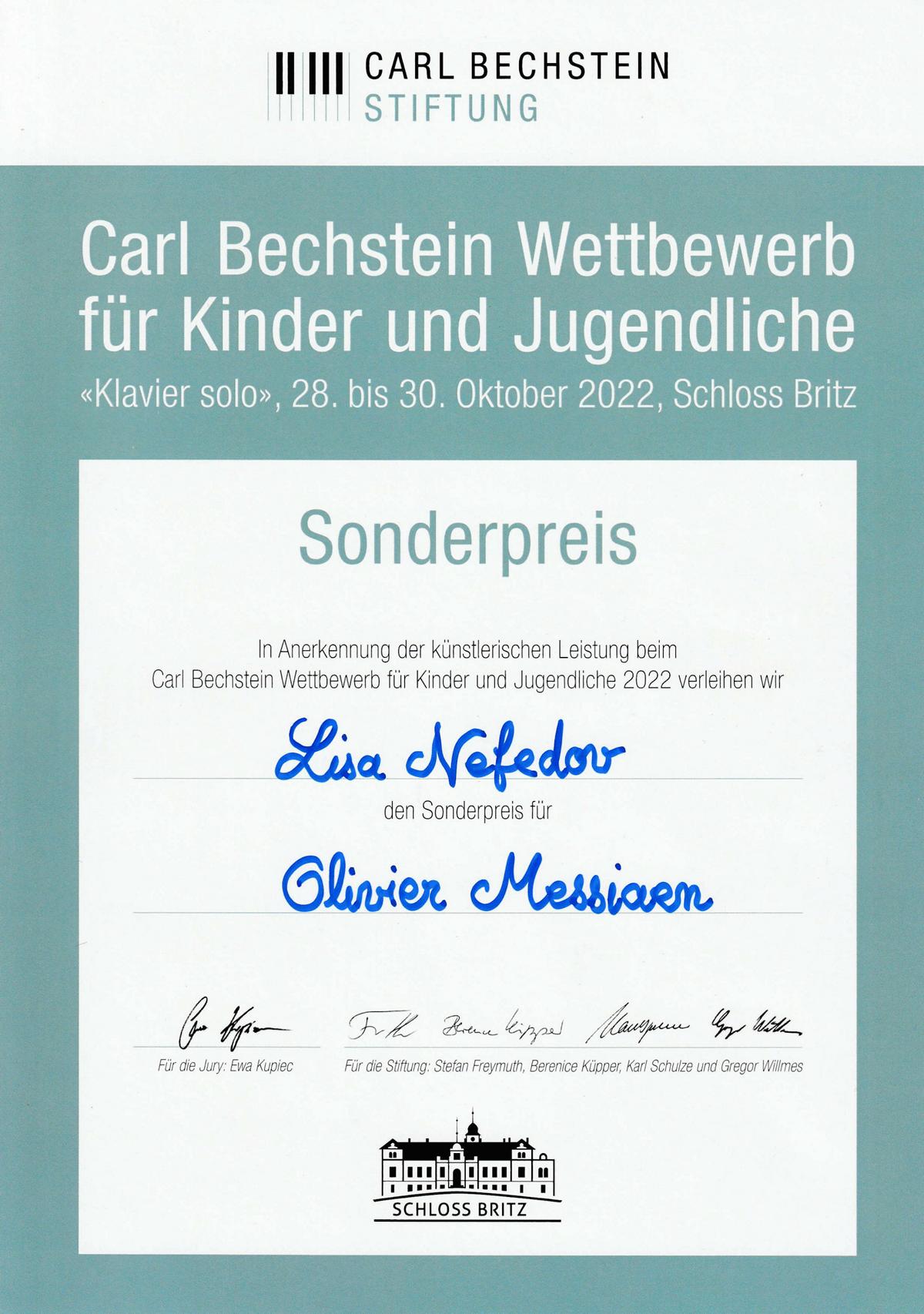 Lisa Nefedov aus der Klasse 10g hat einen Sonderpreis in der Altersgruppe III (14-15 Jahre) für die Interpretation einer Komposition von Olivier Messiaen beim bundesweiten Klavierwettbewerb der Carl Bechstein Stiftung erspielt.