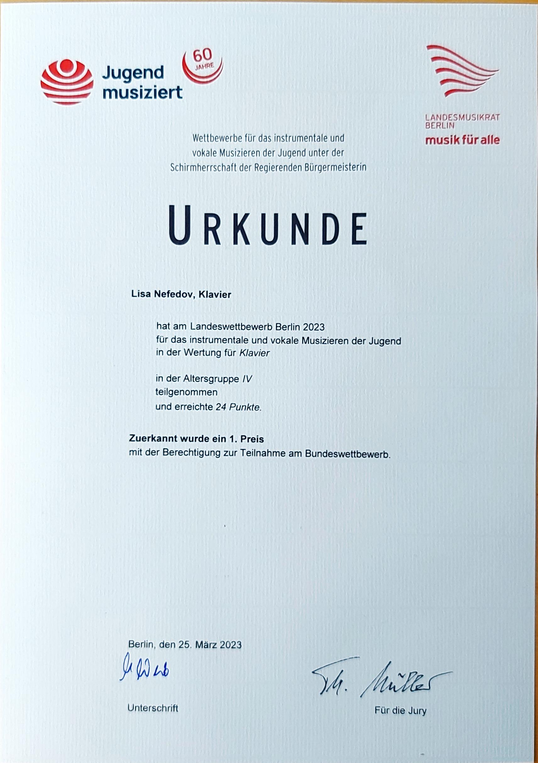 Lisa Nefedov aus der Klasse 10g hat beim Landeswettbwerb Berlin Jugend musiziert einen 1. Platz in der Wertung für Klavier erspielt und nimmt am Bundeswettbewerb teil.