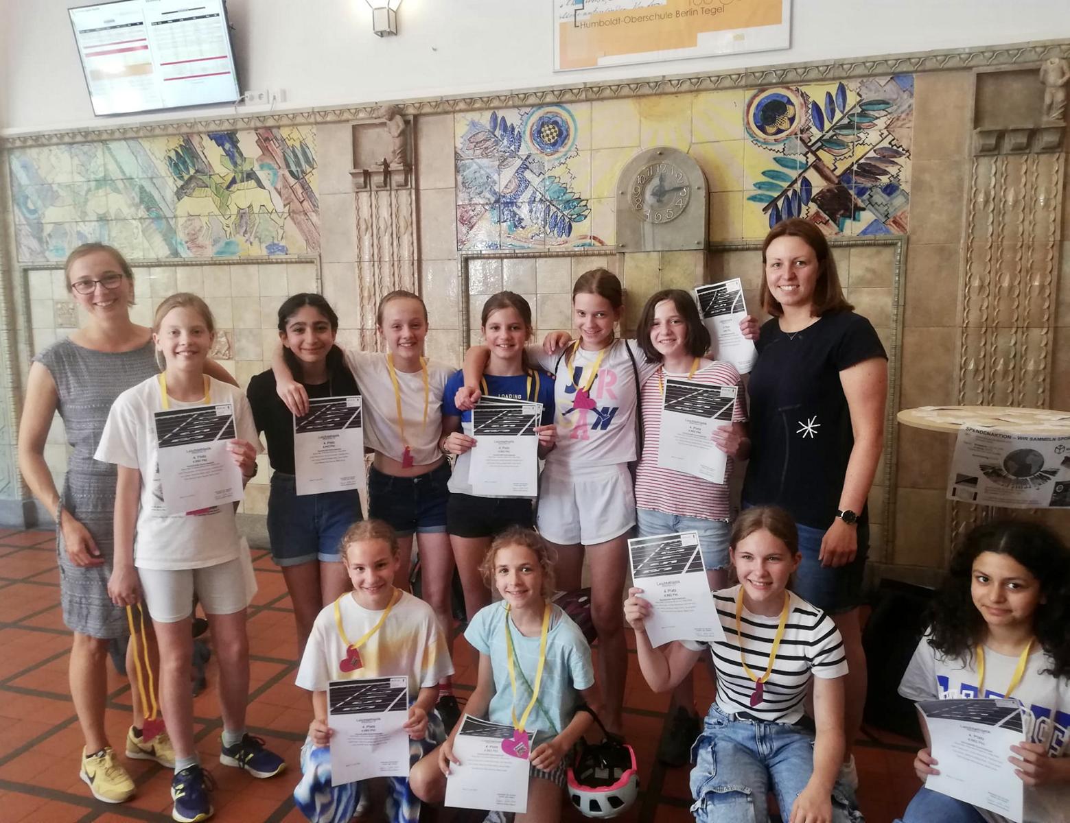 Knapp eine Woche später traten die Mädchen in den gleichen Disziplinen gegen 15 weitere Teams an. Auch die Mädels konnten mit ihren Leistungen überzeugen und belegten mit 4982 Punkten den vierten Platz. Die Entscheidung fiel hier noch knapper aus – nur drei Punkte trennten Platz drei und vier. Leider hatte das enge Ergebnis einen bitteren Beigeschmack, da die drittplatzierte Mannschaft Grauzonen in der Wettkampfausschreibung nutzte. Als kleinen Trost gab es im Anschluss ein Eis für alle und eine extra Siegerehrung in der Schule. Auch hier sind die Leistungen zweier Schülerinnen besonders hervorzuheben: Charlotte Höhn (6h) lief die 50m in der schnellsten Zeit des Tages von 7,34s und Lea Lankes (5h) die 800m als Zweitschnellste in 2:43min.