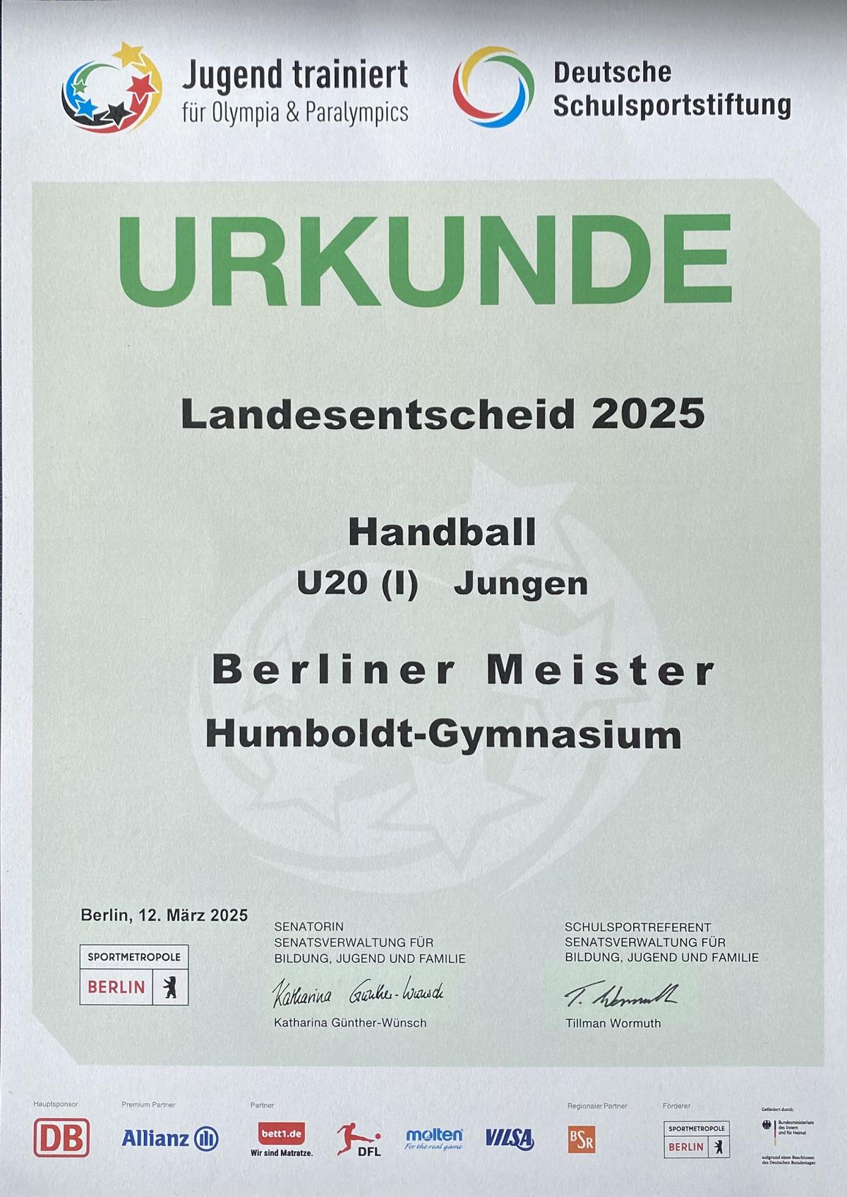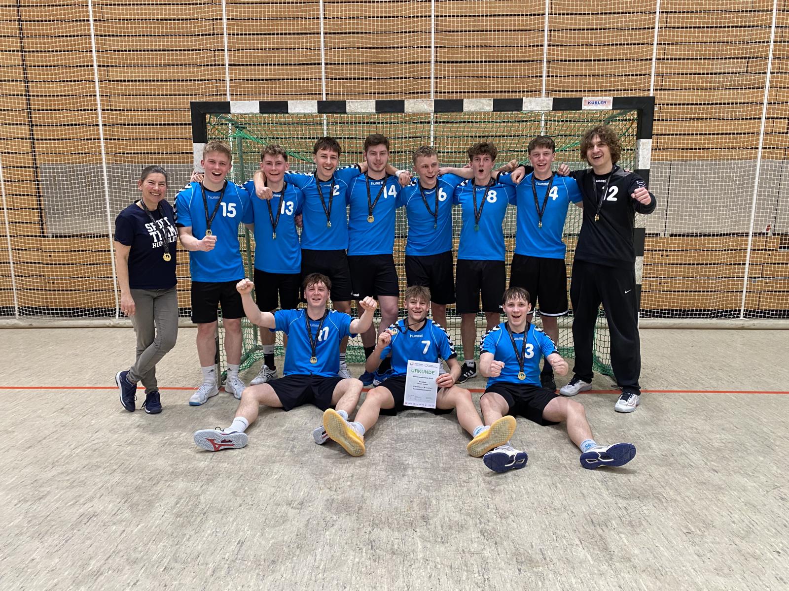 Zum Glück ließen sich die Spieler nicht entmutigen und konnten das Blatt bald wenden. Mit einer sehr beweglichen und gut koordinierten Abwehr unterstützte das Team den schwer zu überwindenden Torhüter Kjell optimal und auch im Angriff wurden Durchbruchchancen dynamisch eröffnet und konsequent abgeschlossen. Und so stand es zur Halbzeit bereits 11:5 für unser Team. Diesen Vorsprung gab die Mannschaft nicht mehr aus der Hand. Auch in der zweiten Halbzeit konnten die Zuschauer einige spektakuläre Abschlüsse bewundern, sodass es am Ende 24:14 für das Team vom Humboldt-Gymnasium hieß. Erfreulicherweise gab es auf allen Positionen Torerfolge zu verzeichnen, aber besonders hervorzuheben sind an dieser Stelle vielleicht unsere erfolgreichsten Werfer Malte und Leon.