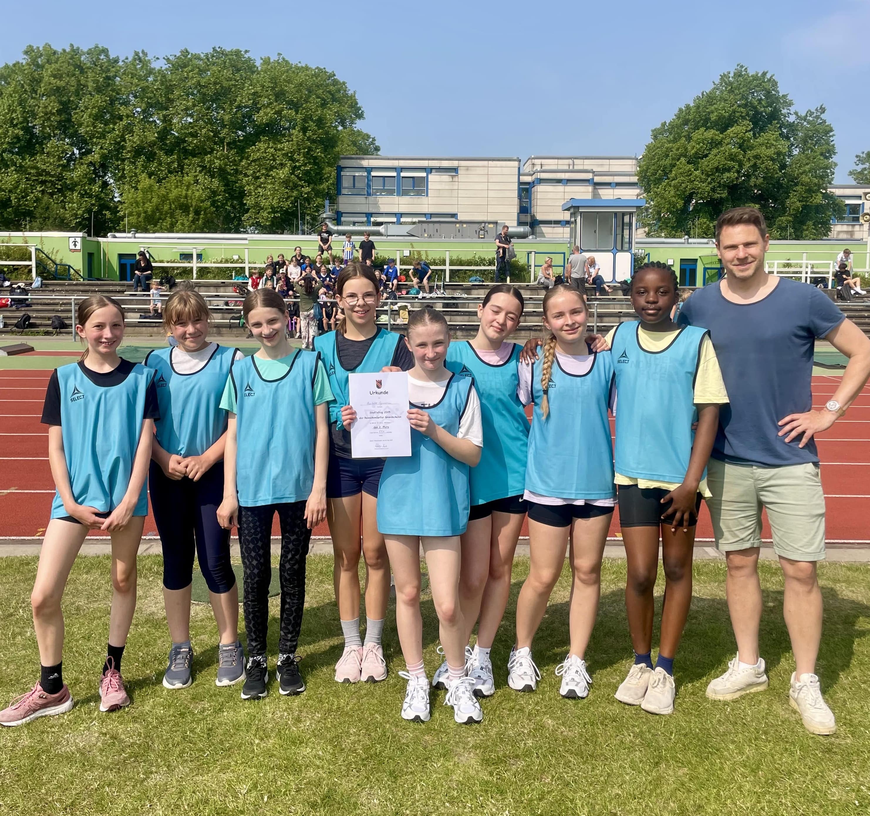 Im Finale verpasste die Jungenstaffel das Treppchen nur knapp und belegte einen sehr respektablen 4. Platz. Die Mädchenstaffel, bestehend aus Sophie Fiedler (6h), Lilli Sonnenschein (6h), Elisa Peterssohn (6h), Johanna Wilhelm (6h), Malou Pawlowski (6g), Ela Kilicaslan (6g), Lisbeth Hermisson (6g) und Lisa Tiogo 6g), lief hingegen ein herausragendes Rennen und sicherte sich den 2. Platz – verbunden mit der Qualifikation für das Berlinfinale am 18. Juni im Stadion Rehberge!