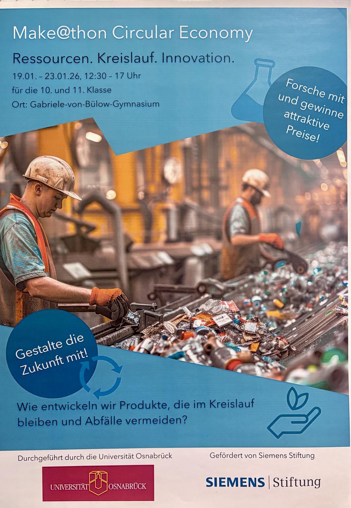15 Schülerinnen und Schüler des Leistungskurses Q1 Chemie der Humboldt- und Bülowschule haben erfolgreich an der vom 19.-23.01.2026 stattfindenden Make@thon-Projektwoche zum Thema „Circular Economy“ teilgenommen.