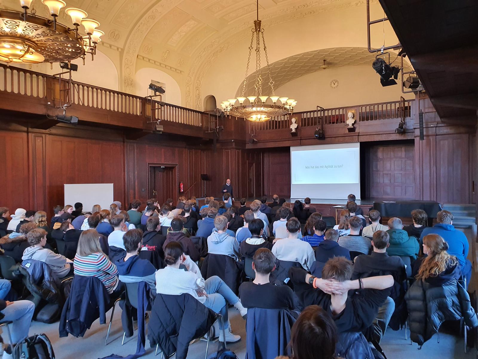 Am 31.01.2024 trafen sich gut 100 Schüler*innen und Lehrer*innen vorwiegend aus den Leistungskursen Wirtschaft und Informatik des Gabriele-von-Bülow-Gymnasiums und des Humboldt-Gymnasiums zum Vortrag von Tassilo Kubitz, der Projektleiter bei der adesso SE ist, einem der führenden IT-Dienstleister in Deutschland. Das Thema lautete: „Warum Agilität die Antwort auf die Anforderungen der Arbeitswelt von morgen ist. Was bedeutet es, agil zu sein?“