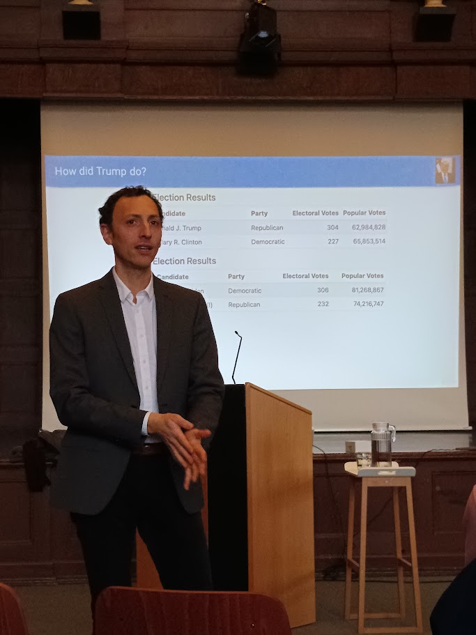 Ein Höhepunkt des Vortrags war Glucrofts Analyse der Ergebnisse der US-Wahlen 2024. Er beleuchtete verschiedene Perspektiven, warum Harris und die Demokraten nicht überzeugen konnten, während Trump erfolgreich war, und hinterfragte dabei Stereotype über bestimmte Wählergruppen. Das Publikum zeigte sich überrascht, dass Harris 11 Millionen Stimmen weniger als Biden bei der letzten Wahl erhielt. Ebenso beeindruckend war die Information, dass der Wahlkampf 2024 insgesamt fast 16 Milliarden Dollar gekostet hat. Mithilfe detaillierter Wahlergebnisse aus Missouri und Voting Prediction Tools veranschaulichte Glucroft außerdem die komplexen Faktoren, die das Wahlverhalten beeinflussen.