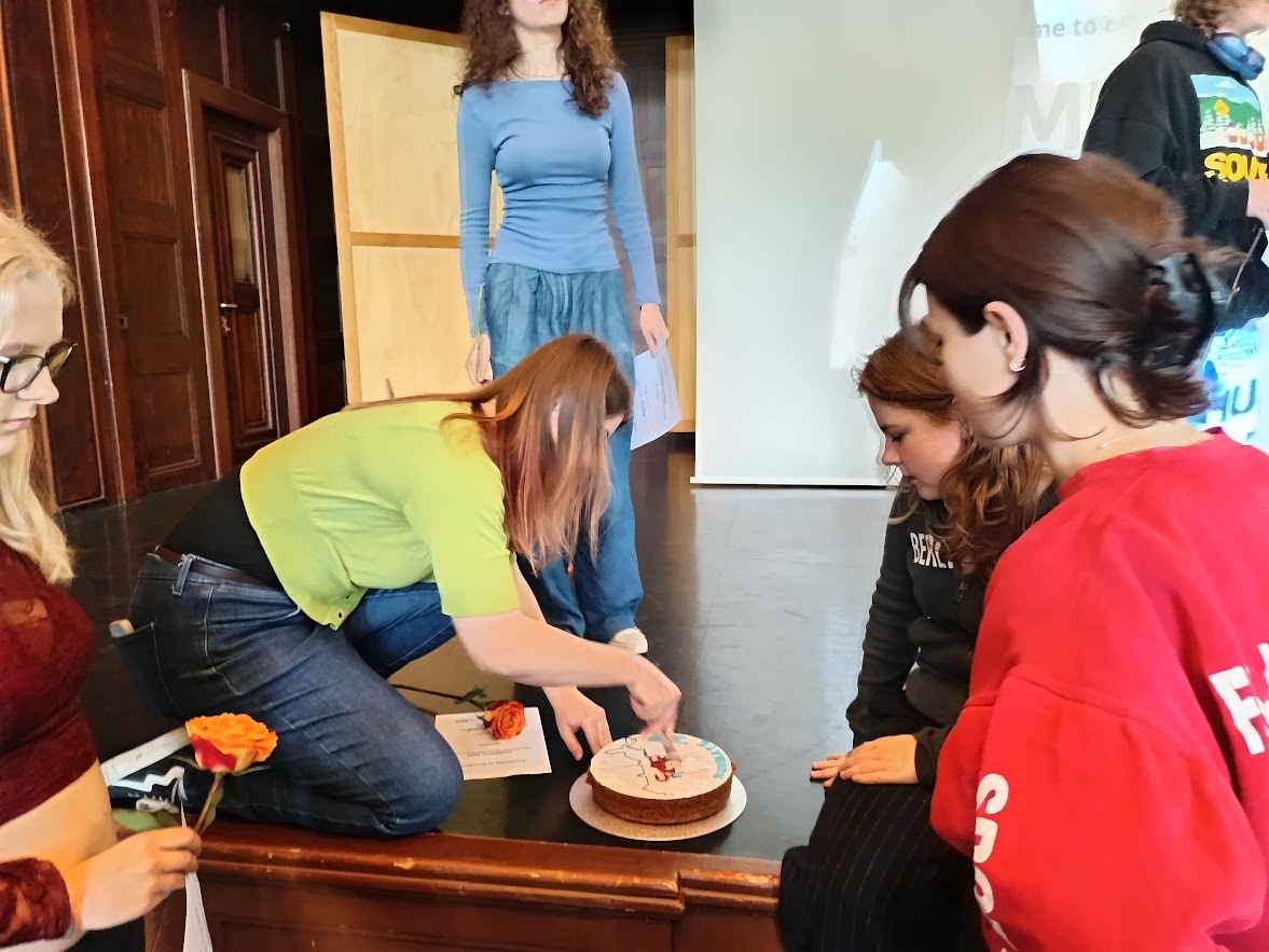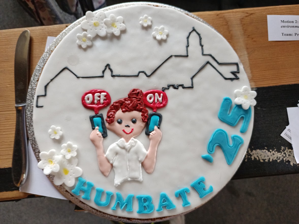 Alle Teilnehmenden bewiesen bei dem Event, dass sie nicht nur bestens vorbereitet, sondern auch kommunikativ versiert und argumentativ stark sind – Fähigkeiten, die im Debating Matters-Wettbewerb entscheidend sein werden. Elisabeth, Dora und Nina debattierten sogar zu zwei Themen. Es ist hervorzuheben, dass Sarah und Fabian aus der 9g sind und sich bemerkenswert gegen die Fragen von 40 Leistungskursschüler:innen behaupten konnten. Die Auszeichnung für die besten Publikumsfragen erhielten Sophia, Hannah und Joseph. Am Ende gab es wieder den berühmten HumCake mit tollem Motiv passend zur Final-Debatte von unserer Haus-und-Hof-Meister-Konditorin von Cake in the City.