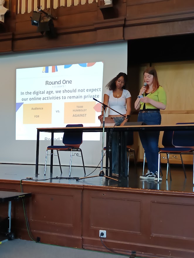 - Lilian und Camille eröffneten die Veranstaltung mit einer klugen und differenzierten Auseinandersetzung zum Thema "In the digital age, we should not expect our online activities to remain private." Sie beeindruckten durch ihre klare Argumentationsstruktur und ihre Fähigkeit, auch auf kritische Zwischenfragen souverän zu reagieren.