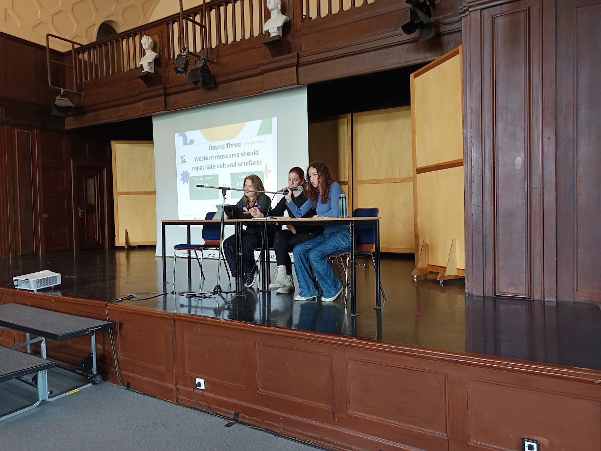 - Die Halbfinal-Debatte zum Thema "Western museums should repatriate cultural artefacts" wurde von Elisabeth, Dora und Nina mit Tiefgang und historischer Genauigkeit geführt. Besonders hervorzuheben ist ihre Fähigkeit, auch moralische und kulturelle Perspektiven klug zu verknüpfen.